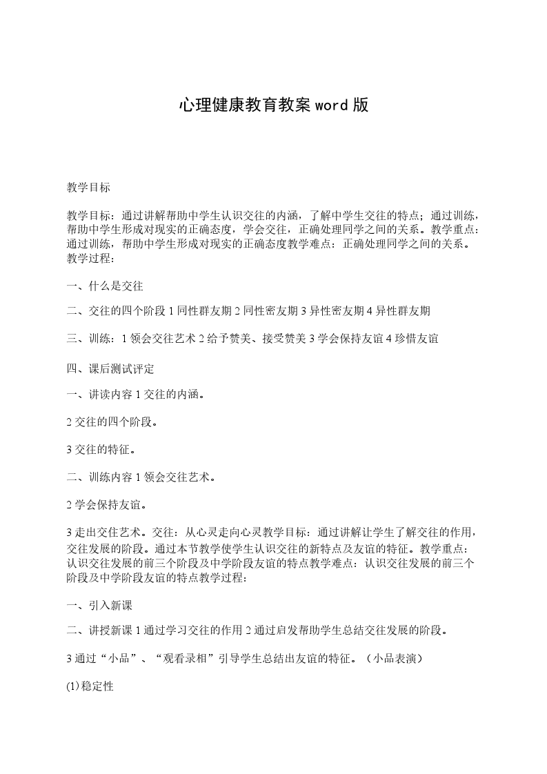 3走出交住艺术。交往:从心灵走向心灵教学目标:通过讲解让学生了解交往的作用,交往发展的阶段。通过本节教学使学生认识交往的新特点及友谊的特征。教学重点:认识交往发展的前三个阶段及中学阶段友谊的特点教学难点:认识交往发展的前三个阶段及中学阶段友谊的特点教学过程: