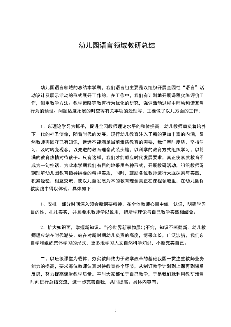 幼儿园语言领域的总结本学期,我们语言组主要是以组织开展全园性“语言”活动设计及展示活动的形式展开工作的,在工作中,我们有计划地开展课程实施评价工作,侧重教学方法、教学策略等教育行为优化的研究,强调活动过程中师幼和谐互动行为的预设、问题适度拓展的时空等有关事项的处理等,主要做了以几方面的工作: