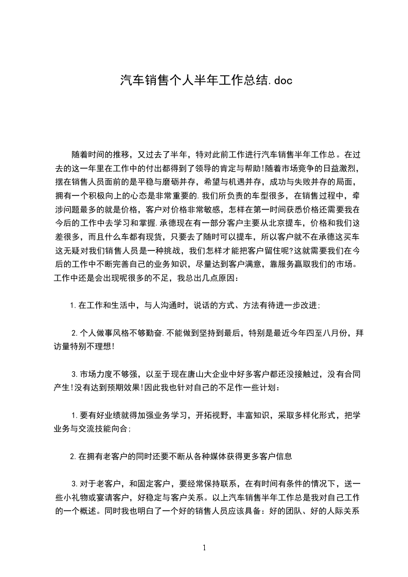 3.对于老客户,和固定客户,要经常保持联系,在有时间有条件的情况下,送一些小礼物或宴请客户,好稳定与客户关系。以上汽车销售半年工作总是我对自己工作的一个概述。同时我也明白了一个好的销售人员应该具备:好的团队、好的人际关系、好的沟通技巧、好的销售策略、好的专业知识、还有一条始终贯穿其中的对销售工作的极度热情!20__年是_公司重要的战略转折期。国内专用车市场的日益激烈的竞争、价格战、国家宏观调控的整体经济环境,给_公司的日常经营和发展造成很大的困难。在全体员工的共同努力下,_专用汽车公司取得了历史性的突破,年销售额、利润等多项指标创历史新高。回顾全年的工作,我们主要围绕面对市场愈演愈烈的价格竞争,我们没有一味地走入“价格战”的误区。“价格是一把双刃剑”,适度的价格促销对销售是有帮助的,可是无限制的价格战却无异于自杀。对于淡季的汽车销售该采用什么样的策略呢?我们摸索了一套对策:对策一:加强销售队伍的目标管理