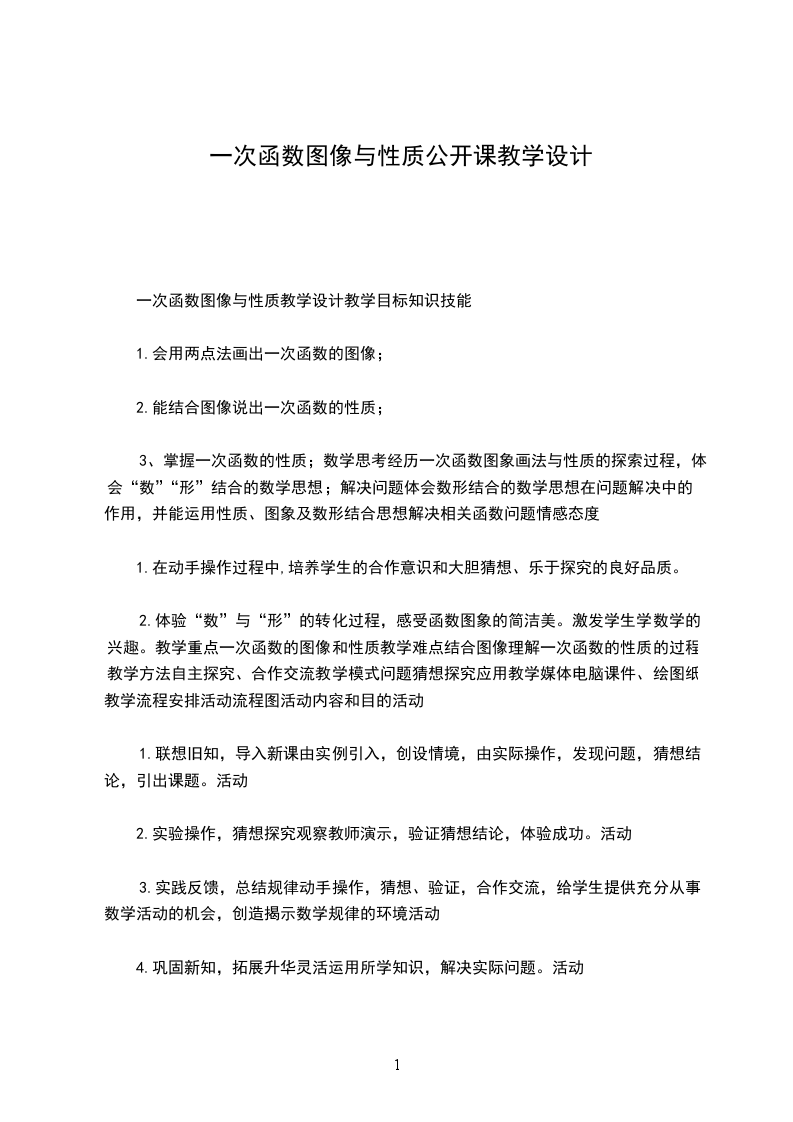 3、掌握一次函数的性质;数学思考经历一次函数图象画法与性质的探索过程,体会“数”“形”结合的数学思想;解决问题体会数形结合的数学思想在问题解决中的作用,并能运用性质、图象及数形结合思想解决相关函数问题情感态度