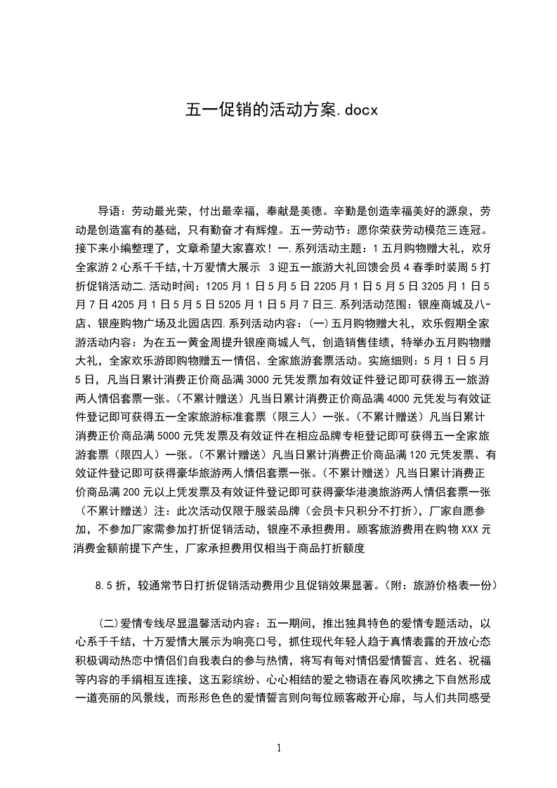 “五一”期间是旅游高峰期,在市民准备前往旅游目的地之前的采购,活动背景:面对年后第一个长假的来临,第一个销售高峰也随之到来,在这个春夏交接的时段,是一个消费较为活跃的时期,尤其是服装和食品类。活动思路:五月正是天气转暧并趋于稳定的季节,也是进行旅游等户外活动的好时期,特举办“锣开五月、玩美假期”活动,“锣开”是大力度的促销活动,为消费者省钱的时间到了,玩美假期”则是假日期间我们将举行很多有意思的活动,此活动的目的就是抓住这段时间的消费者的消费特点。随后还有“母亲节”“助残日”“牛奶节”等爱心大行动贯穿整个五月。活动目的:提高门店销售额,同时增加企业亲和力,树立优良企业形象,培养忠实顾客。活动主题:“锣开五月、玩美假期”主体宣传:1、我开锣、您省钱。