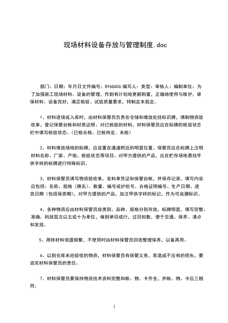 部门:日期:年月日文件编号:DY6G6C6编写人:类型:审核人:编制单位:为了加强施工现场材料、设备的管理,作到有计划地更新购置,正确地使用与维护,确保材料、设备完好,满足检验、试验质量要求,特制定本规定。
