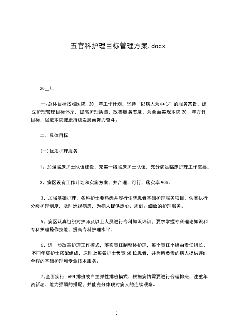 1、根据护理部制定20__年全院护理目标管理总体方案,五官科护理单元认真组织讨论并根据实际情况制定出本科具体目标报护理部审核备案。