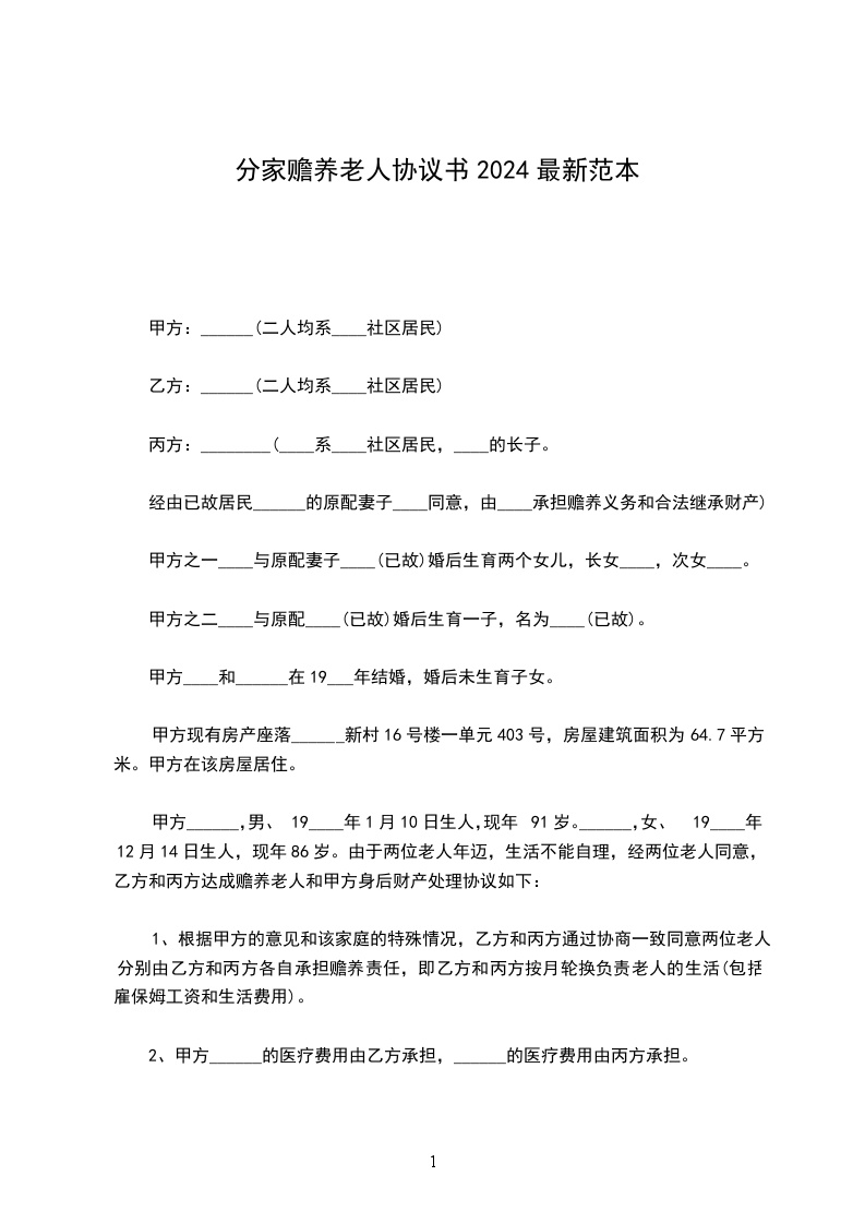 甲方_______________,男、__________年________月________日生人,现年________岁。_______________,女、__________年________月________日生人,现年________岁。由于两位老人年迈,生活不能自理,经两位老人同意,乙方和丙方达成赡养老人和甲方身后财产处理协议如下:
