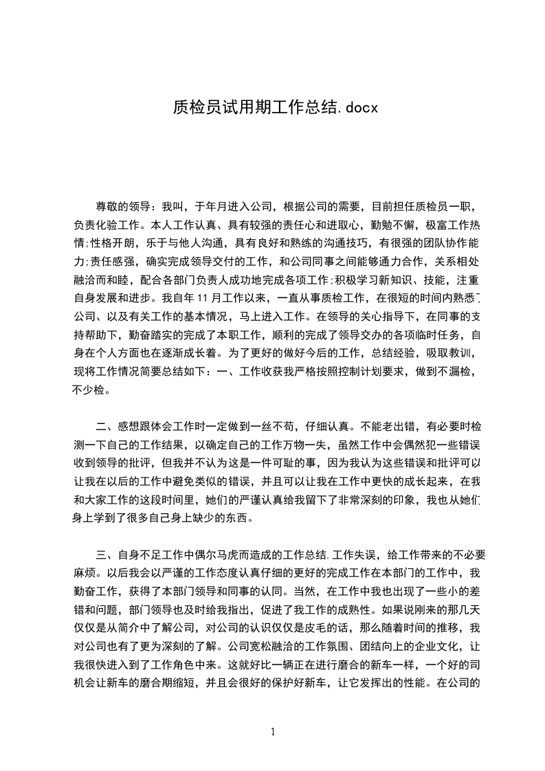 尊敬的领导:我叫,于年月进入公司,根据公司的需要,目前担任质检员一职,负责化验工作。本人工作认真、具有较强的责任心和进取心,勤勉不懈,极富工作热情;性格开朗,乐于与他人沟通,具有良好和熟练的沟通技巧,有很强的团队协作能力;责任感强,确实完成领导交付的工作,和公司同事之间能够通力合作,关系相处融洽而和睦,配合各部门负责人成功地完成各项工作;积极学习新知识、技能,注重自身发展和进步。我自年11月工作以来,一直从事质检工作,在很短的时间内熟悉了公司、以及有关工作的基本情况,马上进入工作。在领导的关心指导下,在同事的支持帮助下,勤奋踏实的完成了本职工作,顺利的完成了领导交办的各项临时任务,自身在个人方面也在逐渐成长着。为了更好的做好今后的工作,总结经验,吸取教训,现将工作情况简要总结如下:一、工作收获我严格按照控制计划要求,做到不漏检,不少检。