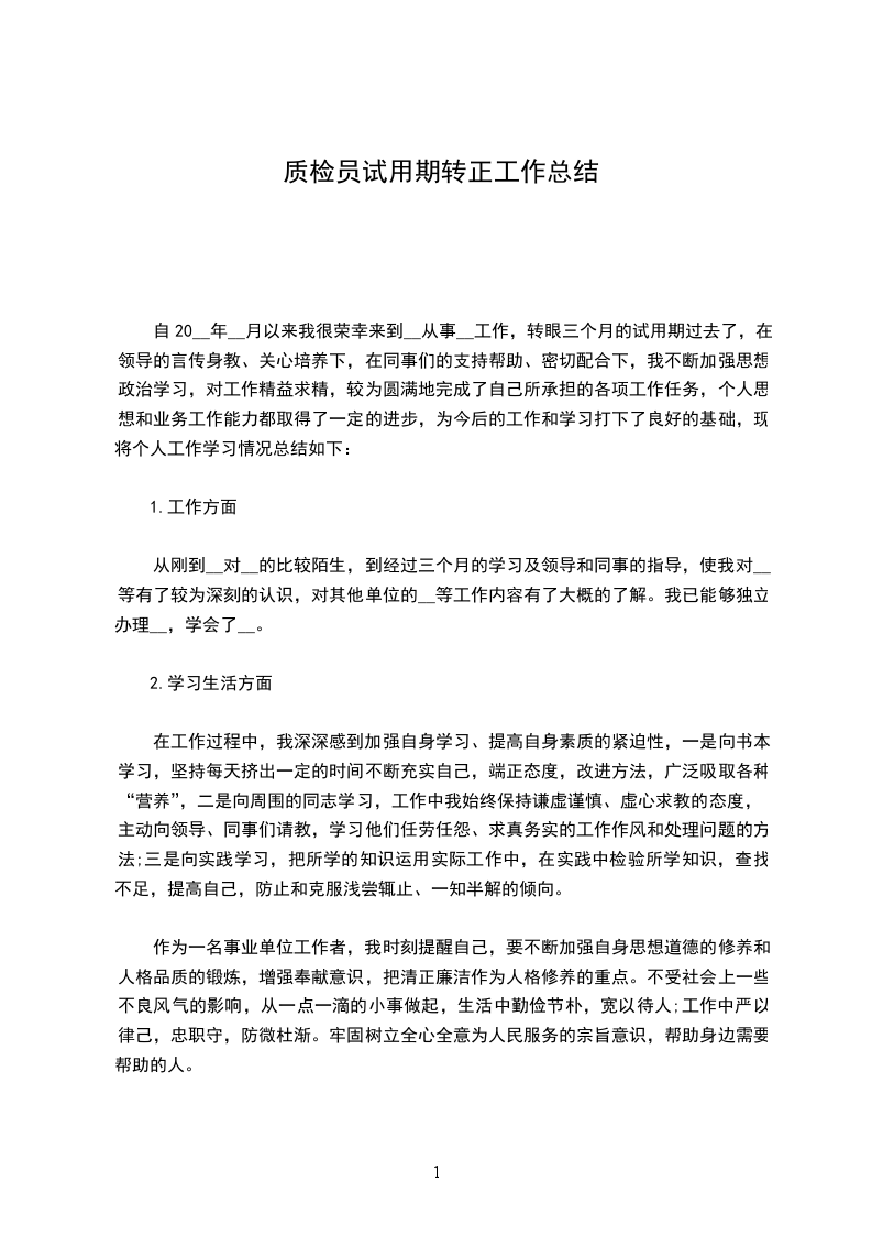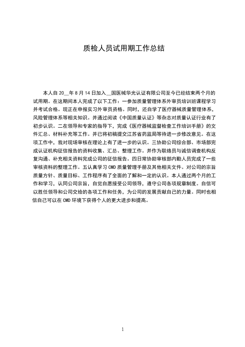 三、自身不足工作中偶尔马虎而造成的工作总结.工作失误,给工作带来的不必要麻烦。以后我会以严谨的工作态度认真仔细的更好的完成工作在本部门的工作中,我勤奋工作,获得了本部门领导和同事的认同。当然,在工作中我也出现了一些小的差错和问题,部门领导也及时给我指出,促进了我工作的成熟性。如果说刚来的那几天仅仅是从简介中了解公司,对公司的认识仅仅是皮毛的话,那么随着时间的推移,我对公司也有了更为深刻的了解。公司宽松融洽的工作氛围、团结向上的企业文化,让我很快进入到了工作角色中来。这就好比一辆正在进行磨合的新车一样,一个好的司机会让新车的磨合期缩短,并且会很好的保护好新车,让它发挥出的性能。在公司的领导下,我会更加严格要求自己,在作好本职工作的同时,积极团结同事,搞好大家之间的关系。在工作中,要不断的学习与积累,不断的提出问题,解决问题,不断完善自我,使工作能够更快、更好的完成。我相信我一定会做好工作,成为优秀的闻天人中的一份子,.不辜负领导对我的期望。建议公司领导:公司要想管理提升,我认为员工素质有待提高,员工的培训时间不够,与工作相关的培训不够。公司每周有半天的培训日。员工每周能得到2小时的培训给员工讲课。总之,在工作中,我深深体会到有一个和谐、共进的团队是非常重要的,有一个积极向上、大气磅礴的公司和领导是员工前进的动力。木集团给了我这样一个发挥的舞台,我就要珍惜这次机会,为公司的发展竭尽全力。在此我提出转正申请,希望自己能成为公司的正式员工,恳请领导予以批准。2024年质检员试用期工作总结.1000字