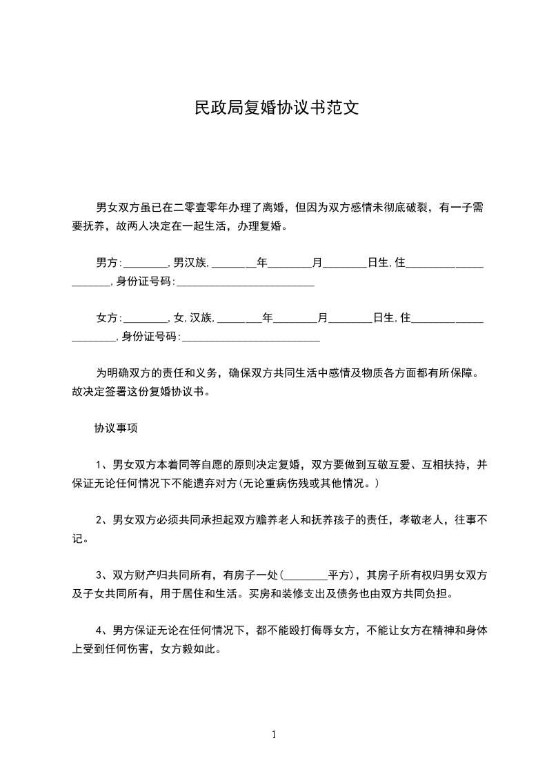 1、男女双方本着同等自愿的原则决定复婚,双方要做到互敬互爱、互相扶持,并保证无论任何情况下不能遗弃对方(无论重病伤残或其他情况。)