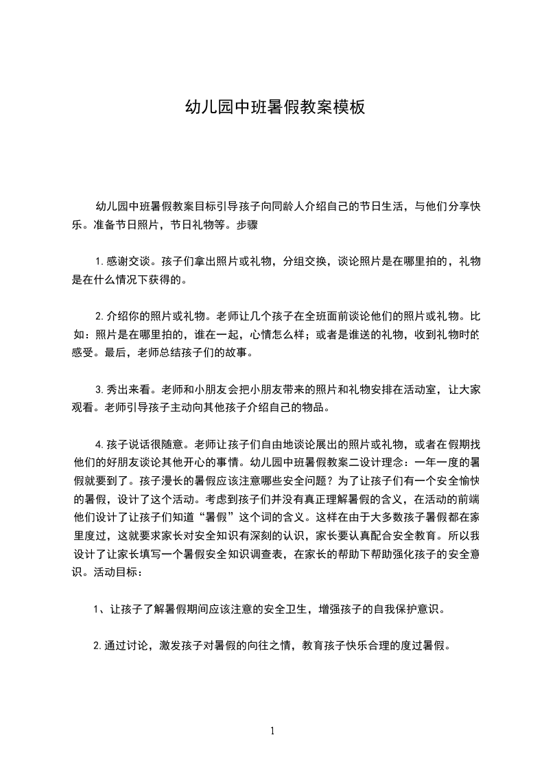 幼儿园中班暑假教案目标引导孩子向同龄人介绍自己的节日生活,与他们分享快乐。准备节日照片,节日礼物等。步骤