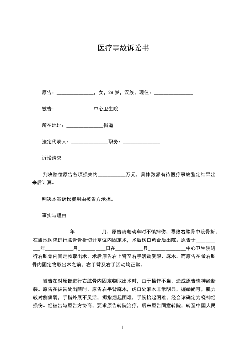 ___________年___________月,原告骑电动车时不慎摔伤,导致右肱骨中段骨折,在当地医院进行肱骨骨折切开复位内固定术,术后伤口愈合后出院。原告于___________年___________月___________日在___________县_______________中心卫生院进行右肱骨内固定物取出术,术后原告右上臂至右手活动受限、麻木。而原告在做右肱骨内固定物取出术之前,右手臂及右手活动均正常。