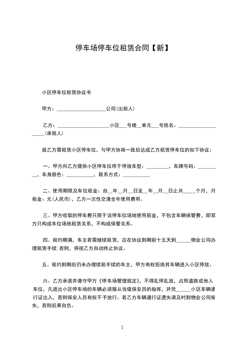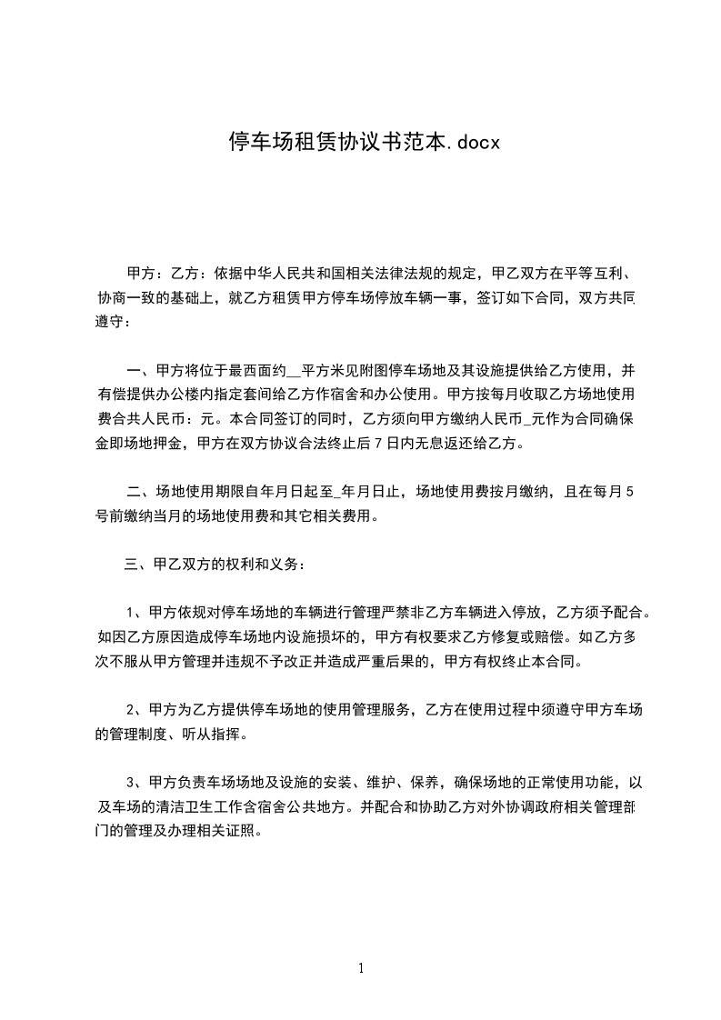甲方:乙方:依据中华人民共和国相关法律法规的规定,甲乙双方在平等互利、协商一致的基础上,就乙方租赁甲方停车场停放车辆一事,签订如下合同,双方共同遵守: