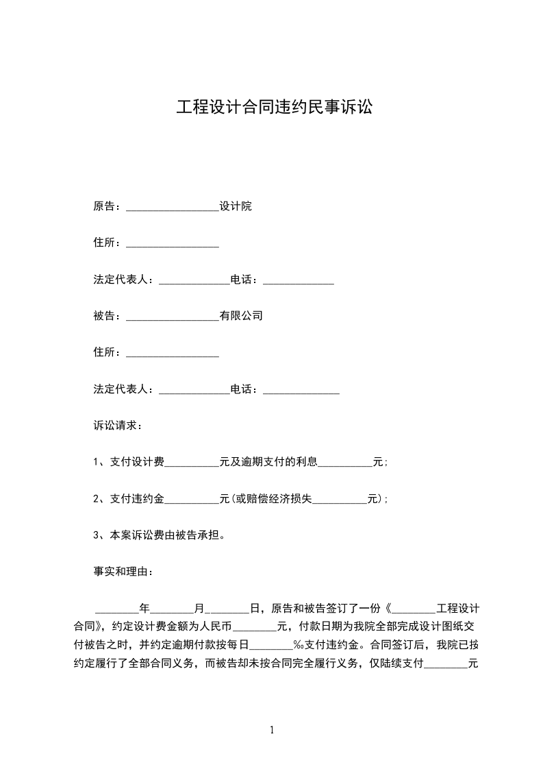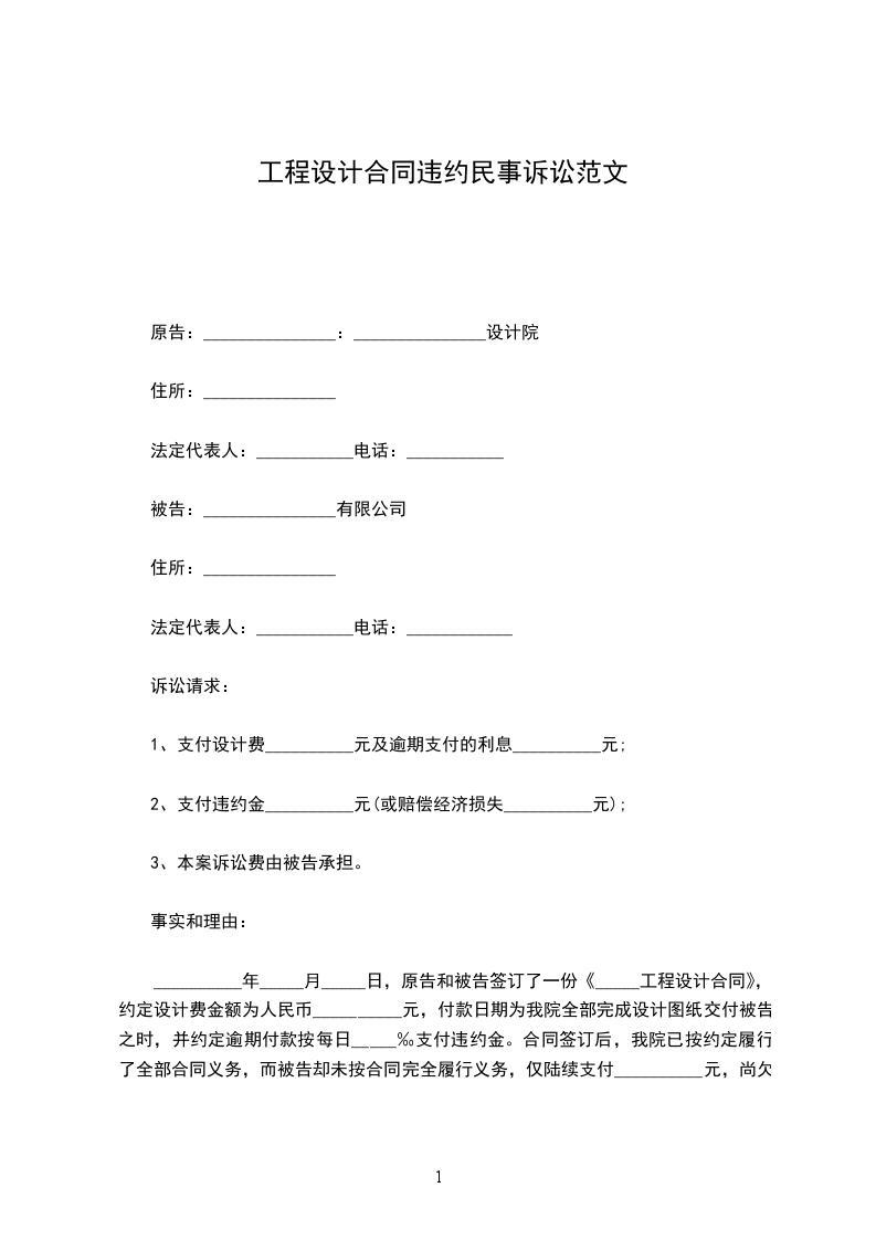 __________年_____月_____日,原告和被告签订了一份《_____工程设计合同》,约定设计费金额为人民币__________元,付款日期为我院全部完成设计图纸交付被告之时,并约定逾期付款按每日_____‰支付违约金。合同签订后,我院已按约定履行了全部合同义务,而被告却未按合同完全履行义务,仅陆续支付__________元,尚欠设计费__________元至今未付。经催要未果,故原告诉至贵院,请求支持原告的诉讼请求,以维护原告的合法权益。