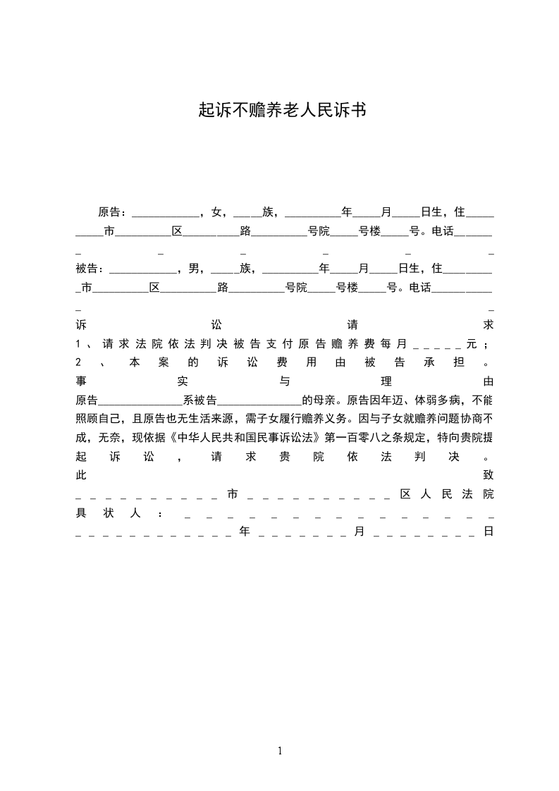 原告_______________系被告_______________的母亲。原告因年迈、体弱多病,不能照顾自己,且原告也无生活来源,需子女履行赡养义务。因与子女就赡养问题协商不成,无奈,现依据《中华人民共和国民事诉讼法》第一百零八之条规定,特向贵院提起诉讼,请求贵院依法判决。