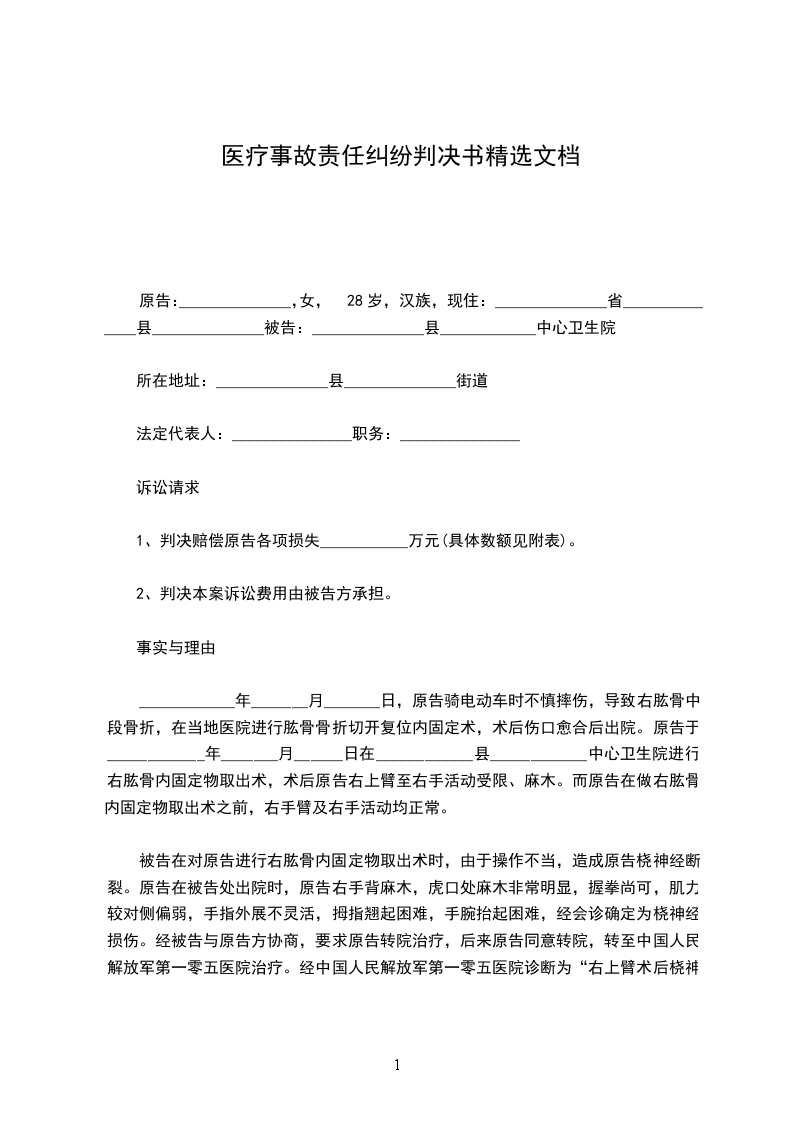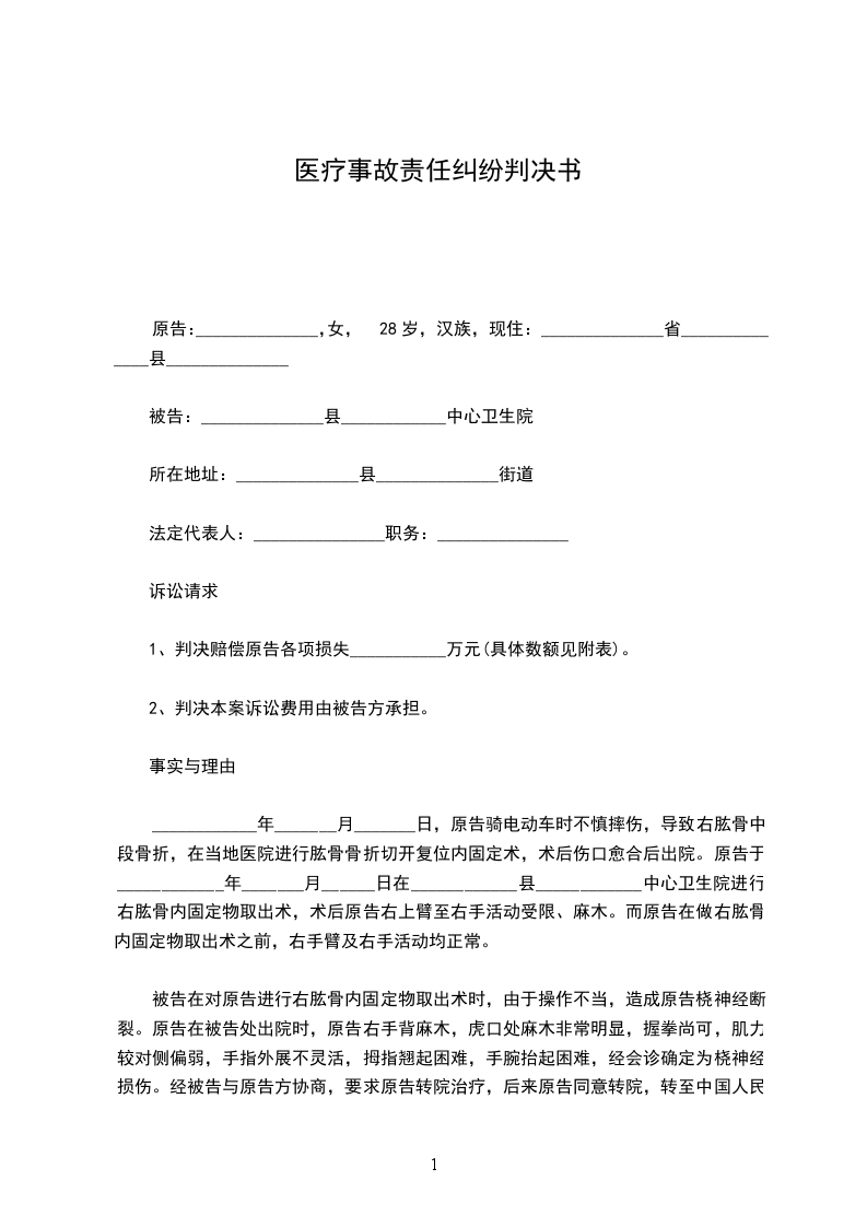 ____________年_______月_______日,原告骑电动车时不慎摔伤,导致右肱骨中段骨折,在当地医院进行肱骨骨折切开复位内固定术,术后伤口愈合后出院。原告于____________年_______月______日在____________县____________中心卫生院进行右肱骨内固定物取出术,术后原告右上臂至右手活动受限、麻木。而原告在做右肱骨内固定物取出术之前,右手臂及右手活动均正常。