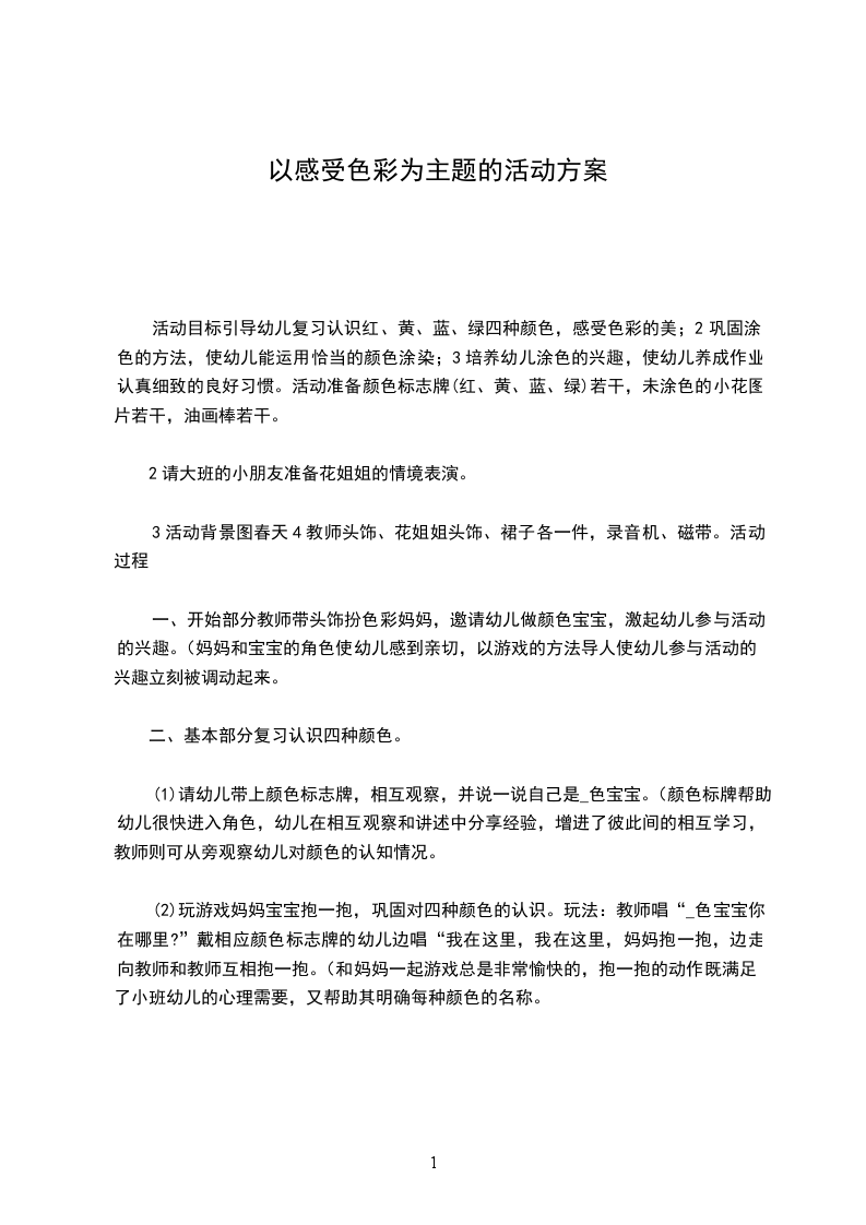 一、开始部分教师带头饰扮色彩妈妈,邀请幼儿做颜色宝宝,激起幼儿参与活动的兴趣。(妈妈和宝宝的角色使幼儿感到亲切,以游戏的方法导人使幼儿参与活动的兴趣立刻被调动起来。