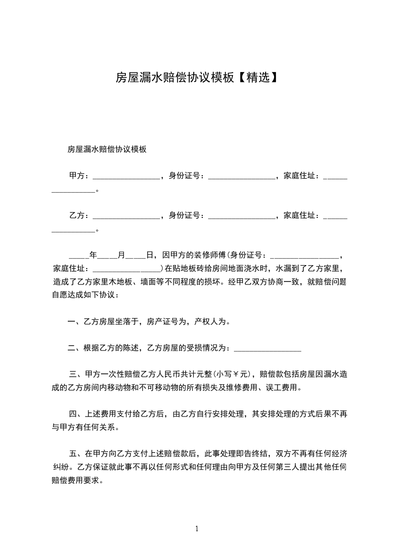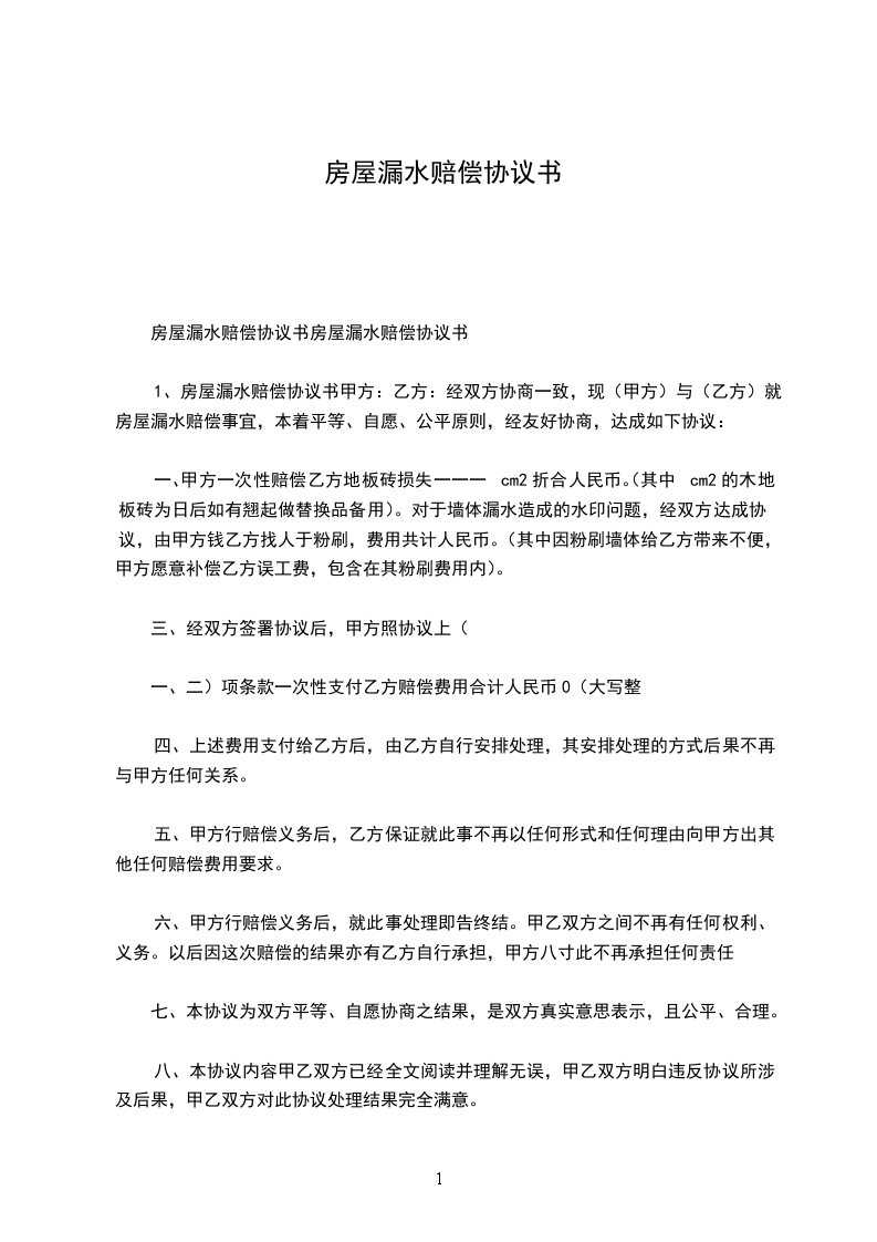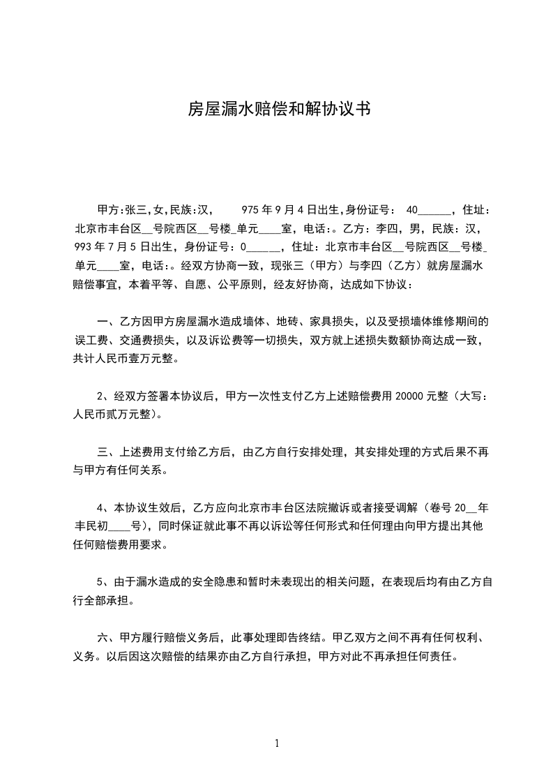 甲方:张三,女,民族:汉,975年9月4日出生,身份证号:40______,住址:北京市丰台区__号院西区__号楼_单元____室,电话:。乙方:李四,男,民族:汉,993年7月5日出生,身份证号:0______,住址:北京市丰台区__号院西区__号楼_单元____室,电话:。经双方协商一致,现张三(甲方)与李四(乙方)就房屋漏水赔偿事宜,本着平等、自愿、公平原则,经友好协商,达成如下协议: