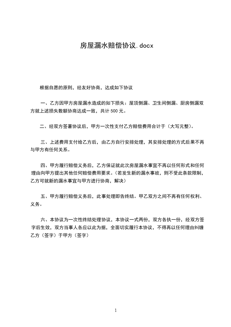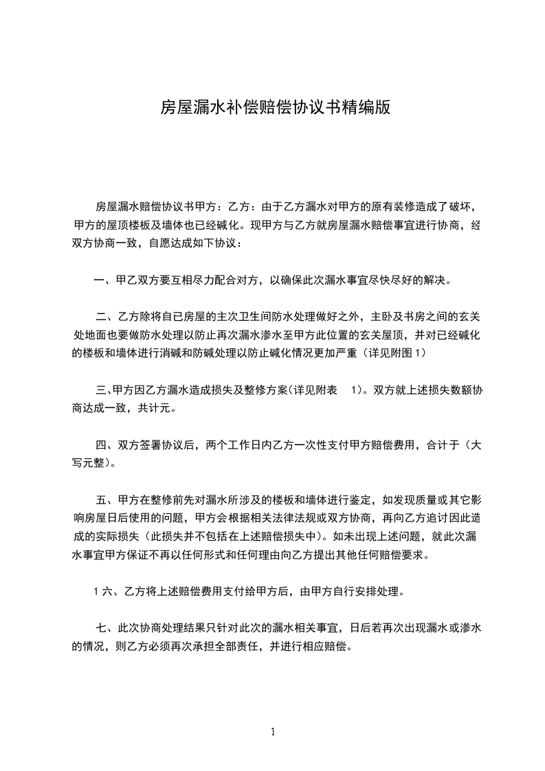 一、乙方因甲方房屋漏水造成墙体、地砖、家具损失,以及受损墙体维修期间的误工费、交通费损失,以及诉讼费等一切损失,双方就上述损失数额协商达成一致,共计人民币壹万元整。