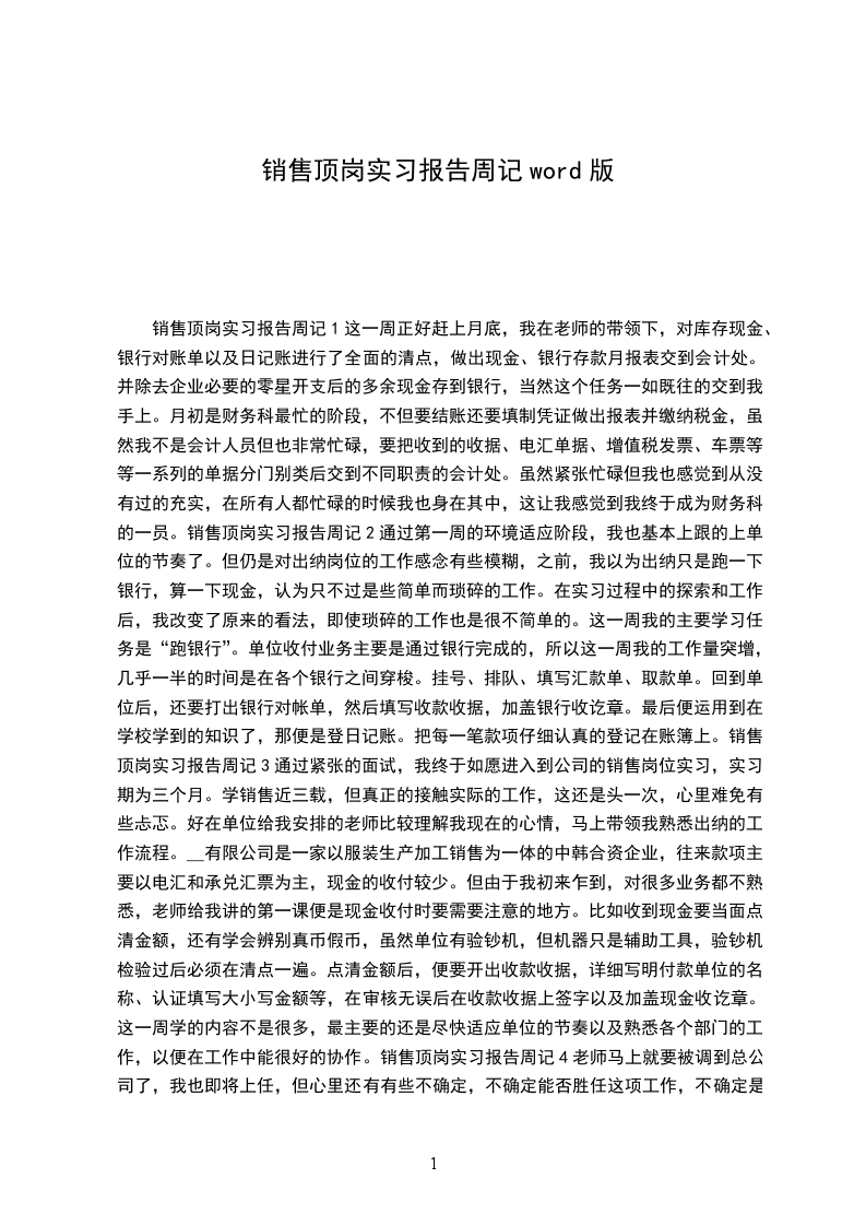 销售顶岗实习报告周记1这一周正好赶上月底,我在老师的带领下,对库存现金、银行对账单以及日记账进行了全面的清点,做出现金、银行存款月报表交到会计处。并除去企业必要的零星开支后的多余现金存到银行,当然这个任务一如既往的交到我手上。月初是财务科最忙的阶段,不但要结账还要填制凭证做出报表并缴纳税金,虽然我不是会计人员但也非常忙碌,要把收到的收据、电汇单据、增值税发票、车票等等一系列的单据分门别类后交到不同职责的会计处。虽然紧张忙碌但我也感觉到从没有过的充实,在所有人都忙碌的时候我也身在其中,这让我感觉到我终于成为财务科的一员。销售顶岗实习报告周记2通过第一周的环境适应阶段,我也基本上跟的上单位的节奏了。但仍是对出纳岗位的工作感念有些模糊,之前,我以为出纳只是跑一下银行,算一下现金,认为只不过是些简单而琐碎的工作。在实习过程中的探索和工作后,我改变了原来的看法,即使琐碎的工作也是很不简单的。这一周我的主要学习任务是“跑银行”。单位收付业务主要是通过银行完成的,所以这一周我的工作量突增,几乎一半的时间是在各个银行之间穿梭。挂号、排队、填写汇款单、取款单。回到单位后,还要打出银行对帐单,然后填写收款收据,加盖银行收讫章。最后便运用到在学校学到的知识了,那便是登日记账。把每一笔款项仔细认真的登记在账簿上。销售顶岗实习报告周记3通过紧张的面试,我终于如愿进入到公司的销售岗位实习,实习期为三个月。学销售近三载,但真正的接触实际的工作,这还是头一次,心里难免有些忐忑。好在单位给我安排的老师比较理解我现在的心情,马上带领我熟悉出纳的工作流程。__有限公司是一家以服装生产加工销售为一体的中韩合资企业,往来款项主要以电汇和承兑汇票为主,现金的收付较少。但由于我初来乍到,对很多业务都不熟悉,老师给我讲的第一课便是现金收付时要需要注意的地方。比如收到现金要当面点清金额,还有学会辨别真币假币,虽然单位有验钞机,但机器只是辅助工具,验钞机检验过后必须在清点一遍。点清金额后,便要开出收款收据,详细写明付款单位的名称、认证填写大小写金额等,在审核无误后在收款收据上签字以及加盖现金收讫章。这一周学的内容不是很多,最主要的还是尽快适应单位的节奏以及熟悉各个部门的工作,以便在工作中能很好的协作。销售顶岗实习报告周记4老师马上就要被调到总公司了,我也即将上任,但心里还有有些不确定,不确定能否胜任这项工作,不确定是否和能同事相处愉快,但“师傅领进门,修行在个人。”即使再忐忑,也终需一个人面对。老师走之前嘱咐我,掌管钱不是小事情,所有与钱有关的东西都必须仔细认真,一旦发生无误损失的不单是公司,我们自己的损失更严重,以后有什么问题三思而后行,遇到不懂或是不确定的要及时打电话问我。原来,一个好老师并不只是你业务而是让你明白自己肩负的责任。