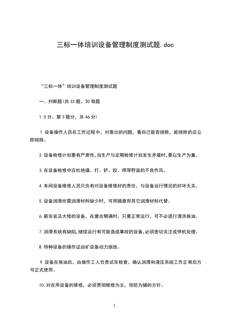 “三标一体”培训设备管理制度测试题