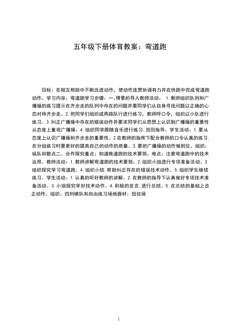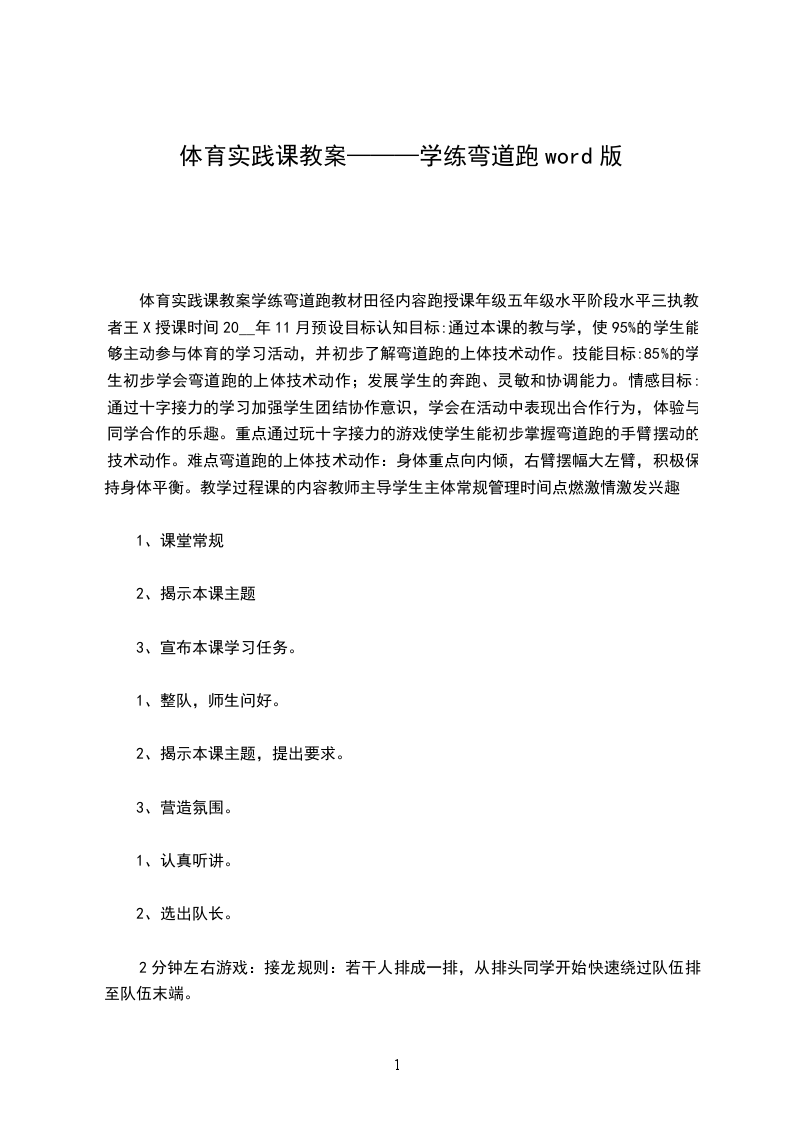 体育实践课教案学练弯道跑教材田径内容跑授课年级五年级水平阶段水平三执教者王X授课时间20__年11月预设目标认知目标:通过本课的教与学,使95%的学生能够主动参与体育的学习活动,并初步了解弯道跑的上体技术动作。技能目标:85%的学生初步学会弯道跑的上体技术动作;发展学生的奔跑、灵敏和协调能力。情感目标:通过十字接力的学习加强学生团结协作意识,学会在活动中表现出合作行为,体验与同学合作的乐趣。重点通过玩十字接力的游戏使学生能初步掌握弯道跑的手臂摆动的技术动作。难点弯道跑的上体技术动作:身体重点向内倾,右臂摆幅大左臂,积极保持身体平衡。教学过程课的内容教师主导学生主体常规管理时间点燃激情激发兴趣