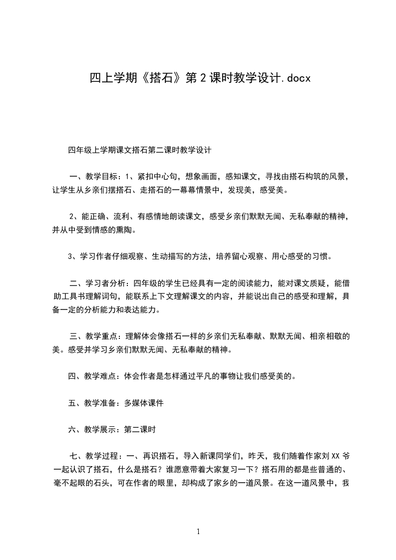 三、教学重点:理解体会像搭石一样的乡亲们无私奉献、默默无闻、相亲相敬的美。感受并学习乡亲们默默无闻、无私奉献的精神。