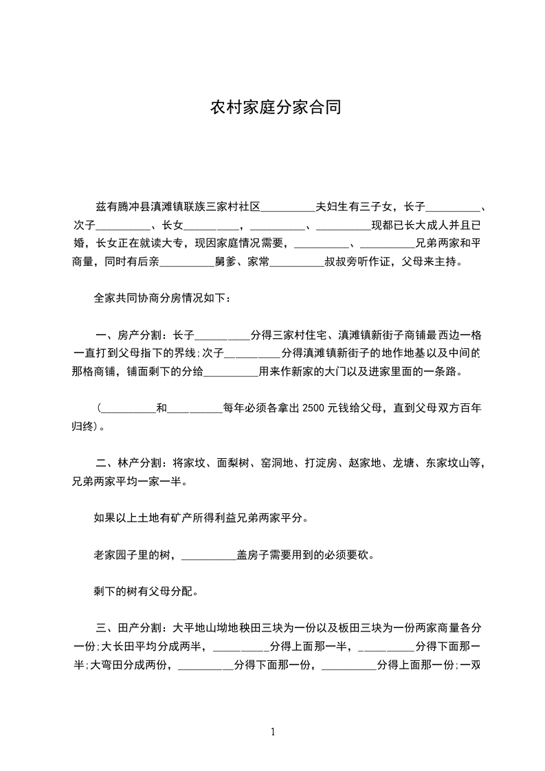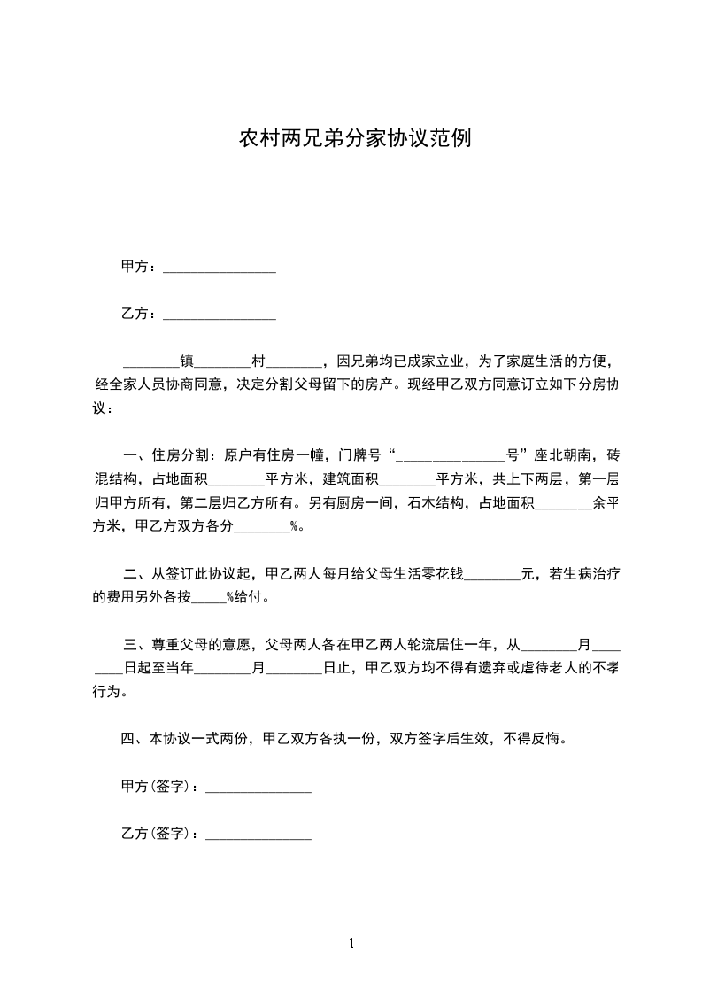 五、本协议共1页一式三份,父和母、甲、乙各执一份,一经签字按手印,兄弟双方对以上协议均不得反悔。未尽事宜兄弟二人协商解决。