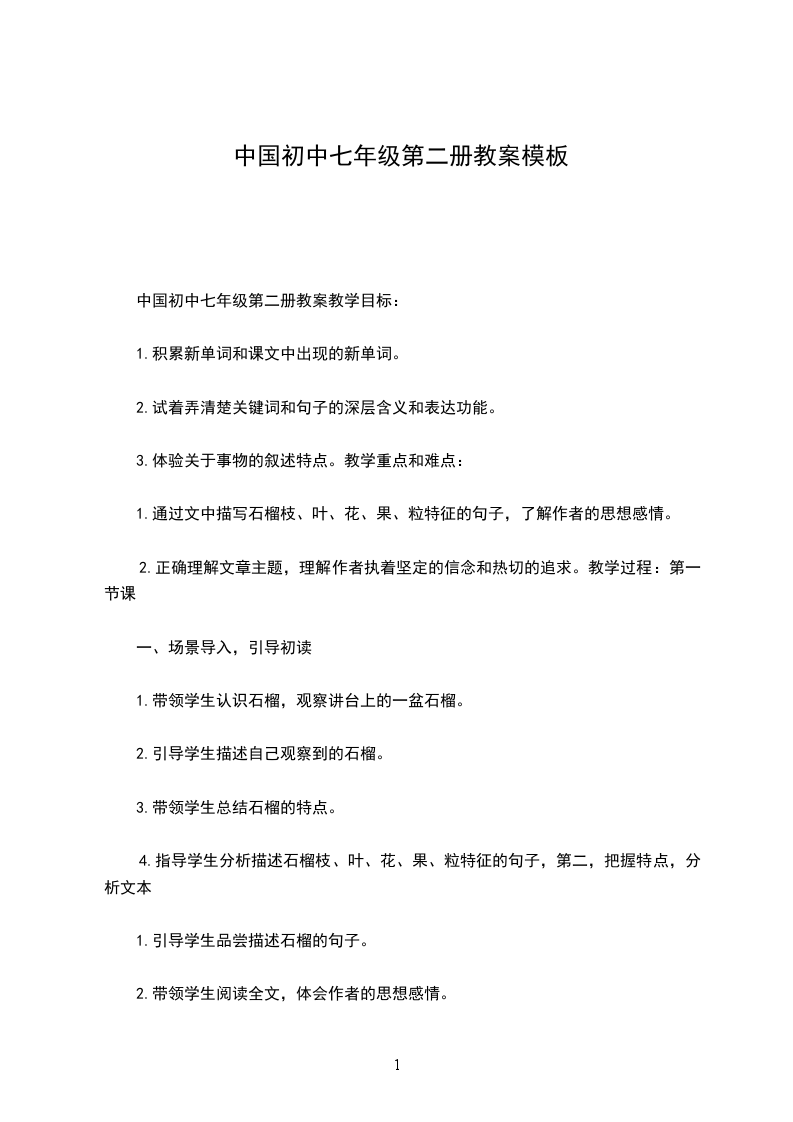 3.引导学生阅读全文,整体把握作者的思想感情。四.本课的总结石榴用托物表达意志,用石榴维系感情,通过对石榴的生动描写歌颂真善美,歌颂不畏胁迫、坚定勇敢、奋发向上的精神品格。也含蓄地表达了一个人执着坚定的信念和热切的追求。第二节课