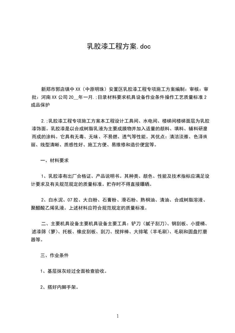 新郑市郭店镇中XX(中原明珠)安置区乳胶漆工程专项施工方案编制:审核:审批:河南XX公司20__年一月.;目录材料要求机具设备作业条件操作工艺质量标准2成品保护