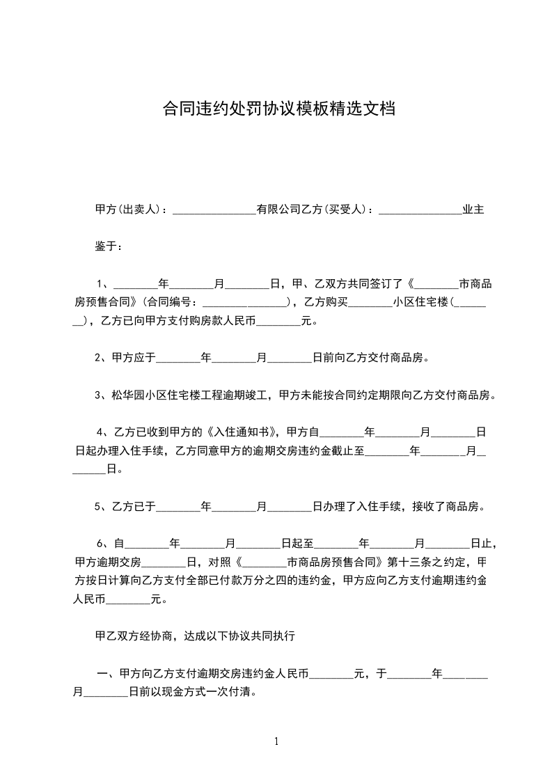 一、甲方向乙方支付逾期交房违约金人民币________元,于________年________月________日前以现金方式一次付清。