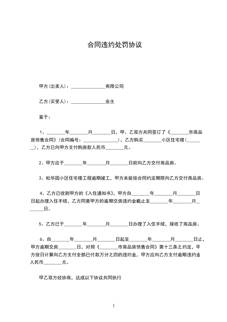 4、乙方已收到甲方的《入住通知书》,甲方自________年________月________日日起办理入住手续,乙方同意甲方的逾期交房违约金截止至________年________月________日。