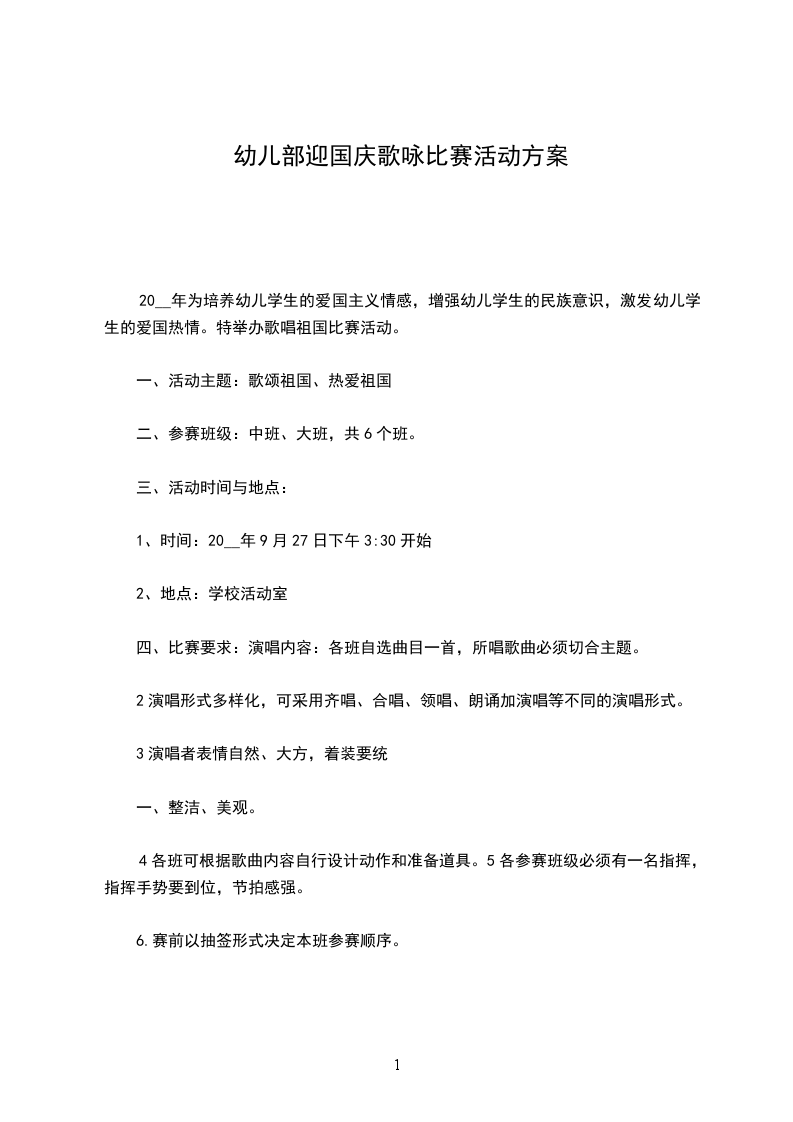 20__年为培养幼儿学生的爱国主义情感,增强幼儿学生的民族意识,激发幼儿学生的爱国热情。特举办歌唱祖国比赛活动。