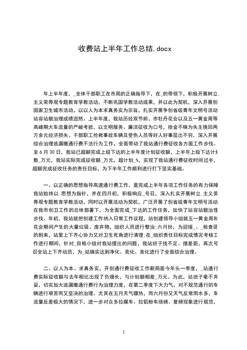 年上半年度,_全体干部职工在市局的正确指导下,在_的带领下,积极开展树立.主义荣辱观专题教育学教活动,不断巩固学教活动成果,并以此为契机,深入开展创国家卫生城市活动,以以人为本求真务实为宗旨,扎实开展争创省级青年文明号活动,站容站貌治理成绩迥然。上半年度,我站历经双节前、市牡丹花会以及五一黄金周等高峰期大车流量的严峻考验,以文明服务、廉洁征收为口号,拾金不昧为失主挽回两万余元经济损失、干部职工抢救事故车辆及受伤人员等好人好事层出不穷,深入开展综合治理逃漏缴通行费不法行为工作,全面带动了我站通行费征收各方面工作步伐。至6月30日,我站已超额完成上级下达的上半年度计划征收额,上半年上级下达计划数_万元,我站实际完成征收额_万元,超计划_%,实现了我站通行费征收时间过半,超额完成征收任务的责任目标,为下半年工作顺利进行打下坚实基础。