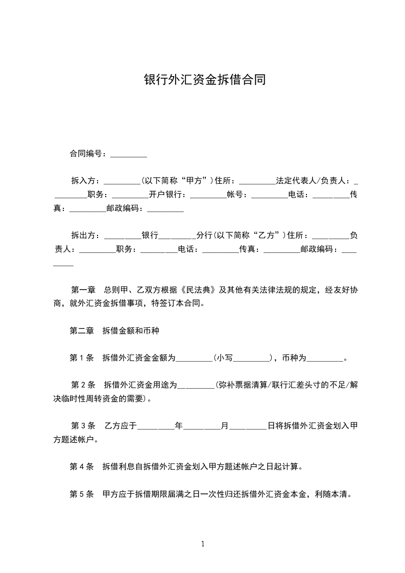 外汇资金拆借合同模板参考拆借合同示例一资金拆出单位(甲方):_资金拆入单位(乙方):_为调剂资金余缺,甲方同意向乙方拆出资金,乙方同意按期归还资金本息。甲、乙双方经协商一致,按以下条款订立本合同:第一条甲方向乙方拆出资金人民币(大写)_元,拆借期限自_年_月_日起至_年_月_日止。共计_天,拆借利率为月息千分之_。