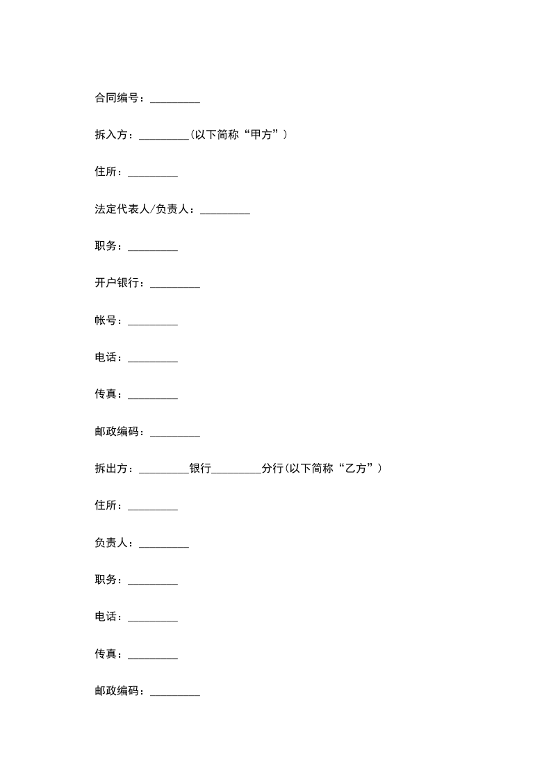 第十二条本合同正本一式二份,甲、乙双方各执一份。甲方(公章):_乙方(公章):_法定代表人(签字):_法定代表人(签字):_签订地点:_签订地点:_年_月_日_年_月_日拆借合同示例二合同编号:_拆出资金单位名称(甲方):_开户银行:_帐号:_电话:_传真:_电传:_拆入资金单位名称(乙方):_开户银行:_帐号:_电话:_传真:_电传:_