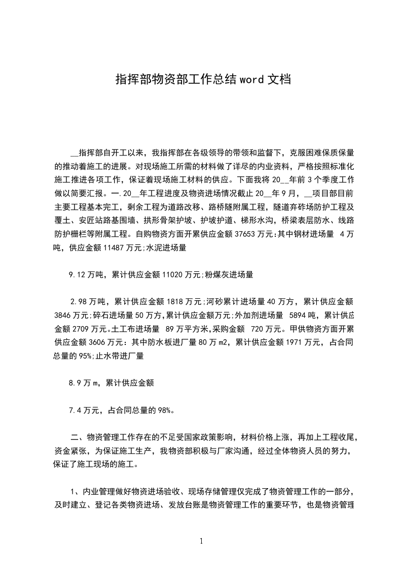 __指挥部自开工以来,我指挥部在各级领导的带领和监督下,克服困难保质保量的推动着施工的进展。对现场施工所需的材料做了详尽的内业资料,严格按照标准化施工推进各项工作,保证着现场施工材料的供应。下面我将20__年前3个季度工作做以简要汇报。一.20__年工程进度及物资进场情况截止20__年9月,__项目部目前主要工程基本完工,剩余工程为道路改移、路桥隧附属工程,隧道弃砟场防护工程及覆土、安匠站路基围墙、拱形骨架护坡、护坡护道、梯形水沟,桥梁表层防水、线路防护栅栏等附属工程。自购物资方面开累供应金额37653万元:其中钢材进场量4万吨,供应金额11487万元;水泥进场量