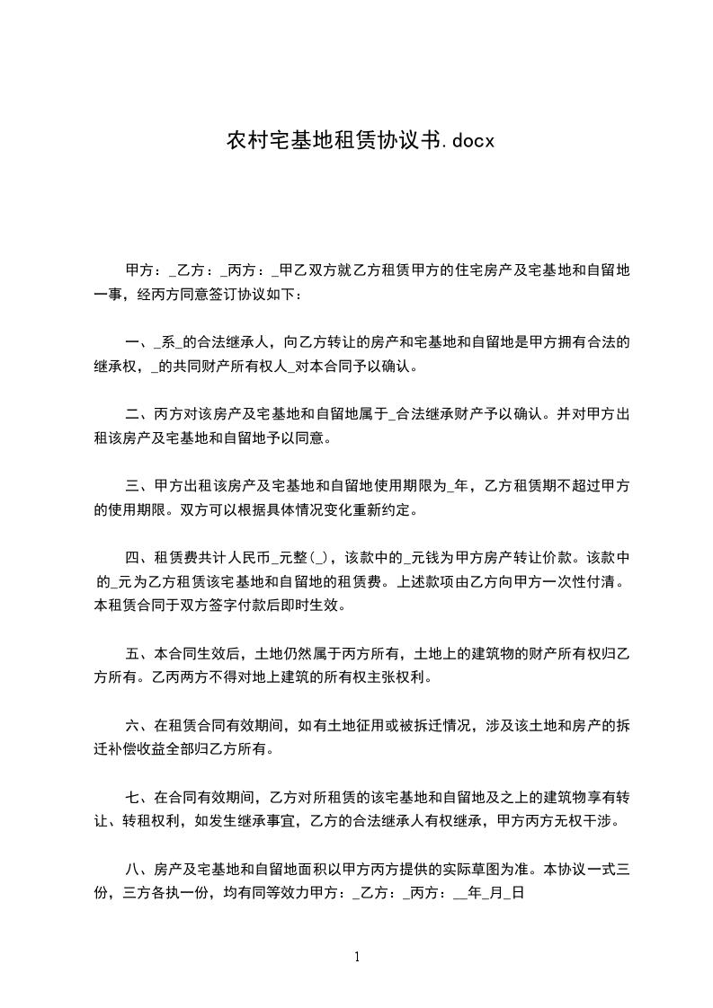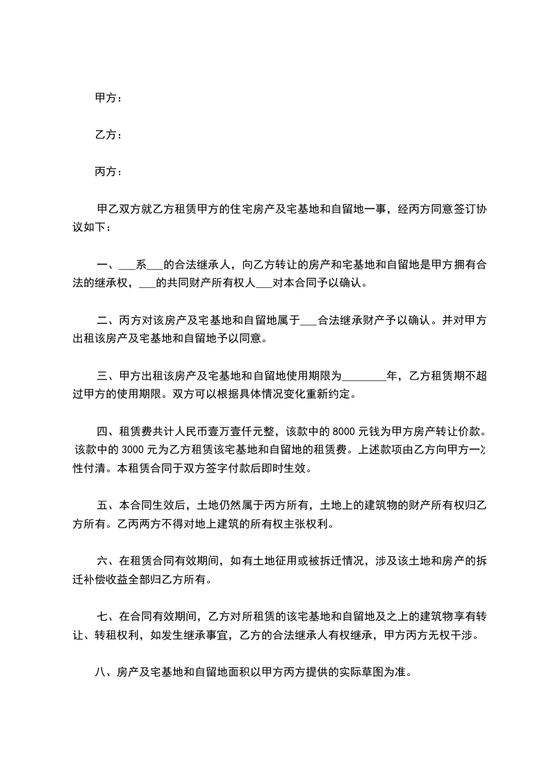 八、本合同租赁期满,乙方应保留本宗宅基地建筑物完整,即本宗地铁皮屋、水井、电光线路完整。