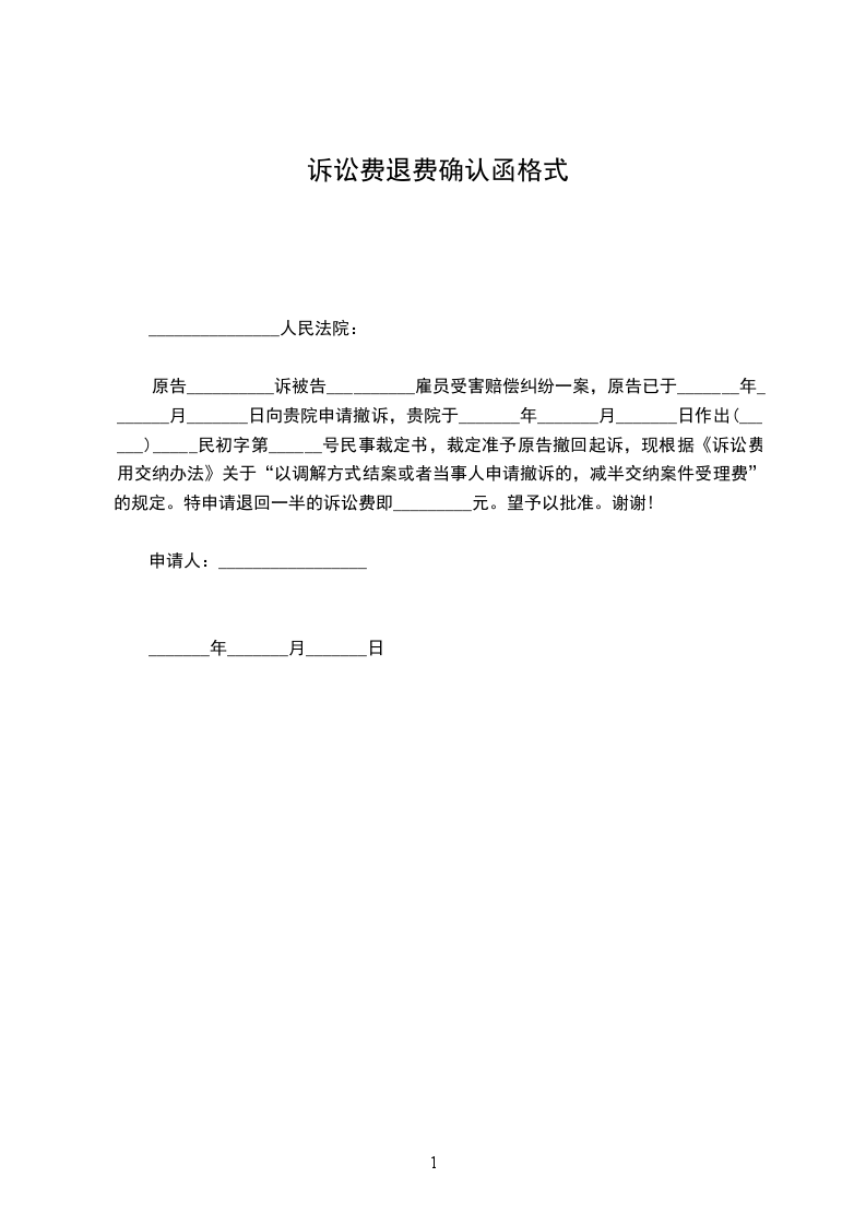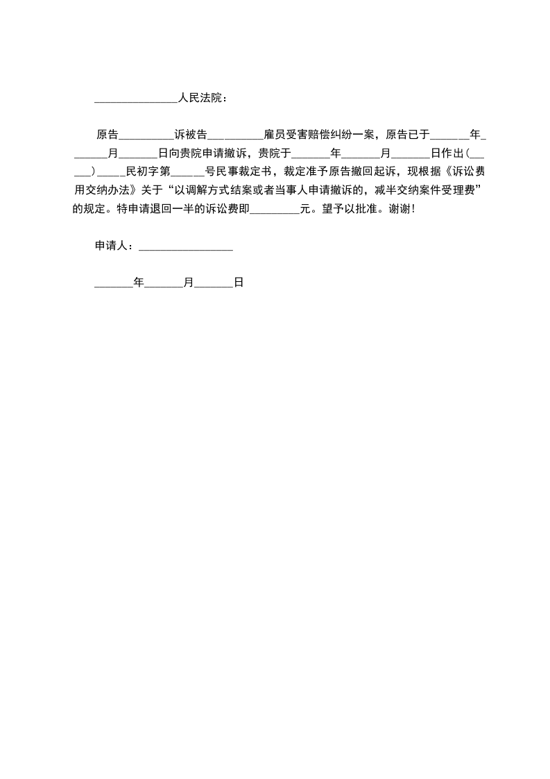 原告__________诉被告__________雇员受害赔偿纠纷一案,原告已于_______年_______月_______日向贵院申请撤诉,贵院于_______年_______月_______日作出(______)_____民初字第______号民事裁定书,裁定准予原告撤回起诉,现根据《诉讼费用交纳办法》关于“以调解方式结案或者当事人申请撤诉的,减半交纳案件受理费”的规定。特申请退回一半的诉讼费即_________元。望予以批准。谢谢!