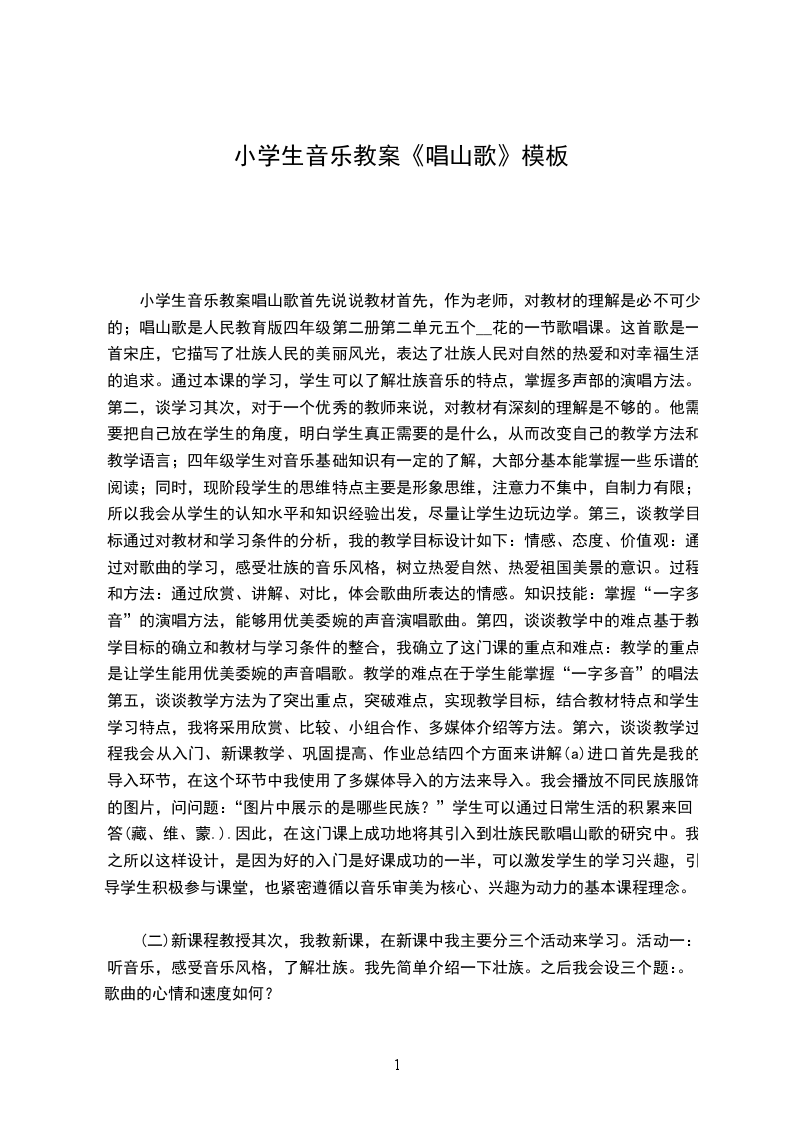 小学生音乐教案唱山歌首先说说教材首先,作为老师,对教材的理解是必不可少的;唱山歌是人民教育版四年级第二册第二单元五个__花的一节歌唱课。这首歌是一首宋庄,它描写了壮族人民的美丽风光,表达了壮族人民对自然的热爱和对幸福生活的追求。通过本课的学习,学生可以了解壮族音乐的特点,掌握多声部的演唱方法。第二,谈学习其次,对于一个优秀的教师来说,对教材有深刻的理解是不够的。他需要把自己放在学生的角度,明白学生真正需要的是什么,从而改变自己的教学方法和教学语言;四年级学生对音乐基础知识有一定的了解,大部分基本能掌握一些乐谱的阅读;同时,现阶段学生的思维特点主要是形象思维,注意力不集中,自制力有限;所以我会从学生的认知水平和知识经验出发,尽量让学生边玩边学。第三,谈教学目标通过对教材和学习条件的分析,我的教学目标设计如下:情感、态度、价值观:通过对歌曲的学习,感受壮族的音乐风格,树立热爱自然、热爱祖国美景的意识。过程和方法:通过欣赏、讲解、对比,体会歌曲所表达的情感。知识技能:掌握“一字多音”的演唱方法,能够用优美委婉的声音演唱歌曲。第四,谈谈教学中的难点基于教学目标的确立和教材与学习条件的整合,我确立了这门课的重点和难点:教学的重点是让学生能用优美委婉的声音唱歌。教学的难点在于学生能掌握“一字多音”的唱法。第五,谈谈教学方法为了突出重点,突破难点,实现教学目标,结合教材特点和学生学习特点,我将采用欣赏、比较、小组合作、多媒体介绍等方法。第六,谈谈教学过程我会从入门、新课教学、巩固提高、作业总结四个方面来讲解(a)进口首先是我的导入环节,在这个环节中我使用了多媒体导入的方法来导入。我会播放不同民族服饰的图片,问问题:“图片中展示的是哪些民族?”学生可以通过日常生活的积累来回答(藏、维、蒙.).因此,在这门课上成功地将其引入到壮族民歌唱山歌的研究中。我之所以这样设计,是因为好的入门是好课成功的一半,可以激发学生的学习兴趣,引导学生积极参与课堂,也紧密遵循以音乐审美为核心、兴趣为动力的基本课程理念。