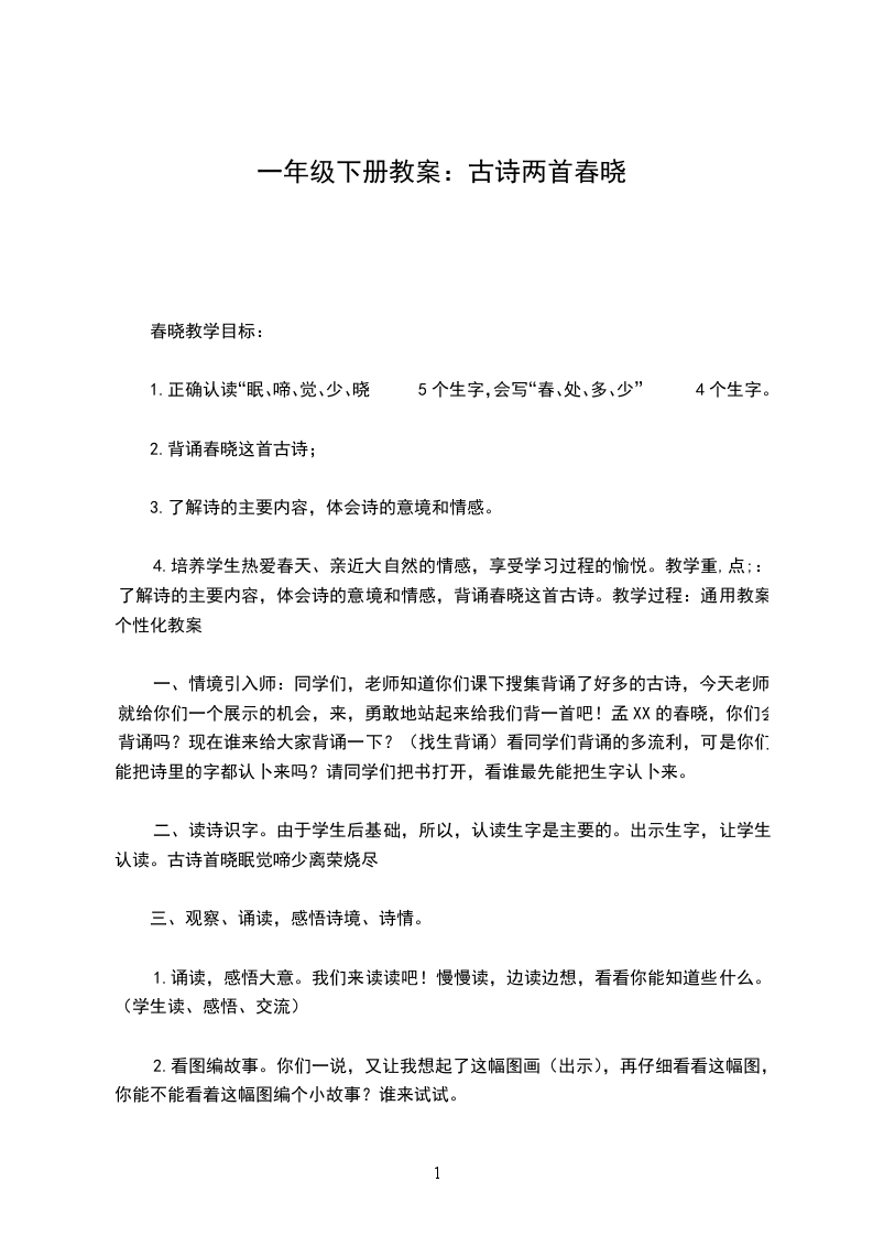 4.培养学生热爱春天、亲近大自然的情感,享受学习过程的愉悦。教学重,点;:了解诗的主要内容,体会诗的意境和情感,背诵春晓这首古诗。教学过程:通用教案个性化教案