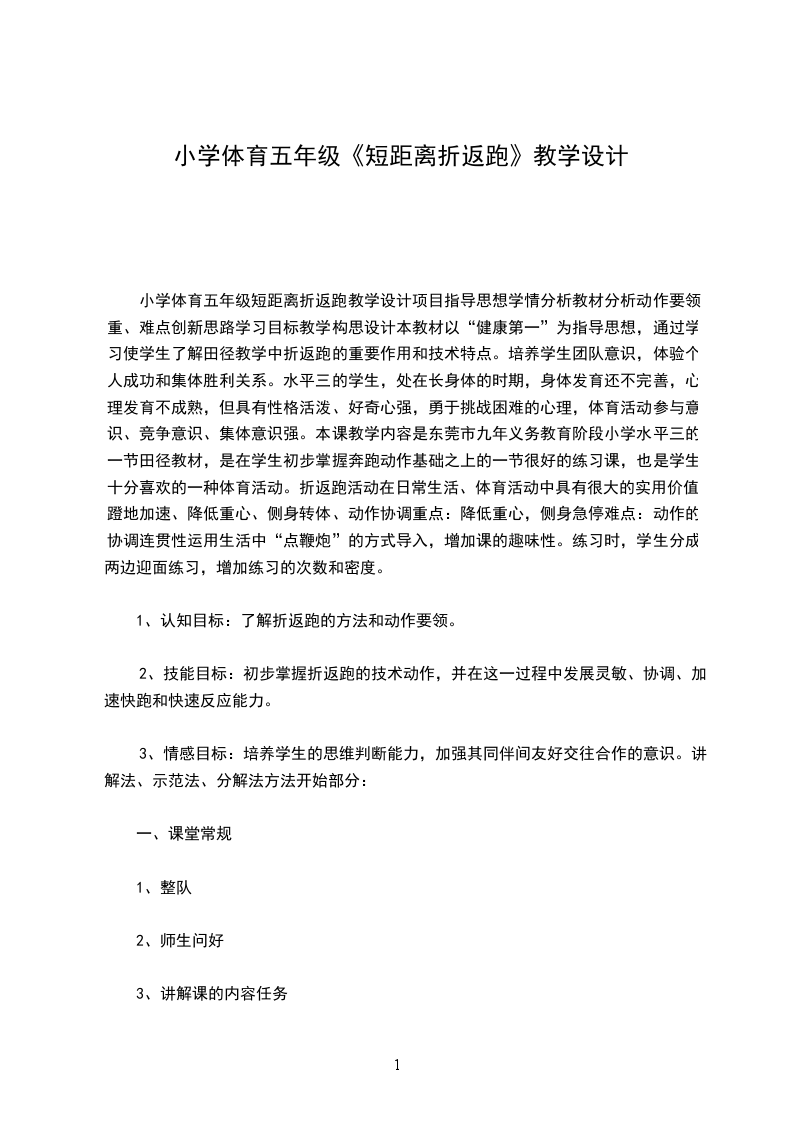 2、技能目标:通过练习,发展学生速度素质及奔跑能力,提高心肺功能;锻炼学生的反应速度。