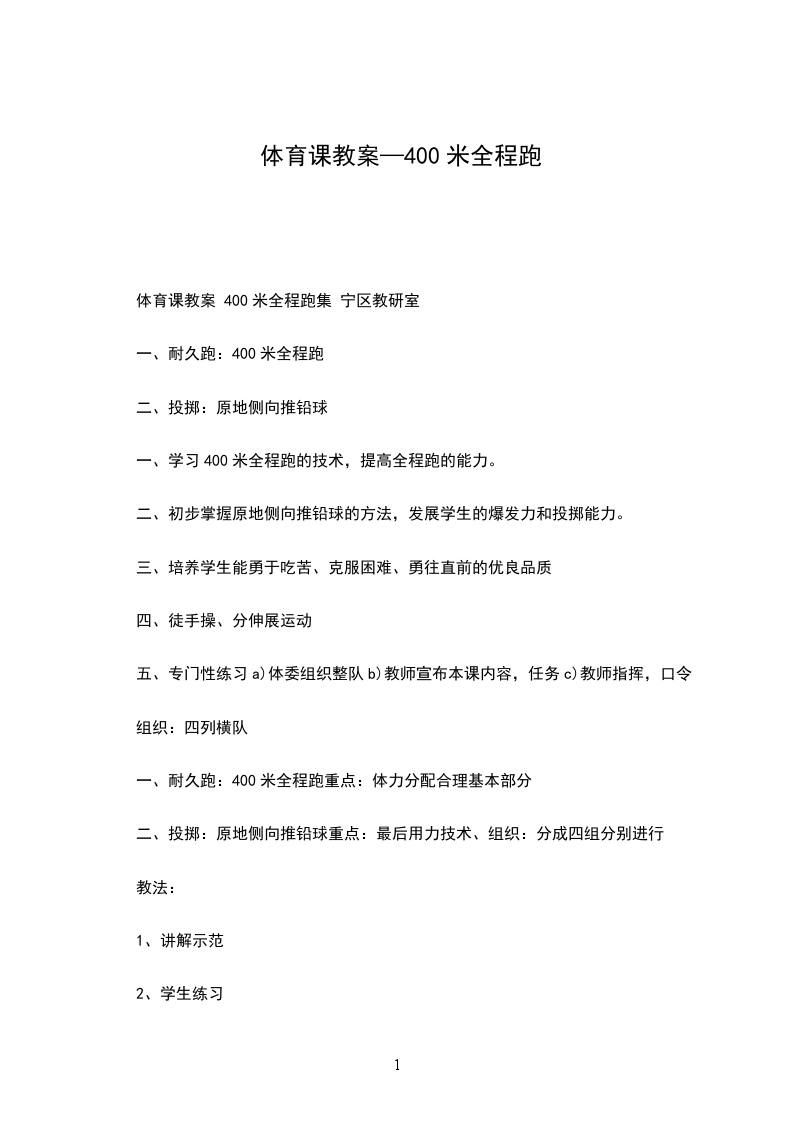 1、认真学习教授内容组织:要求:1、顾及每个同学,让学生们积极参与到素质练习中、充分的活动身体.