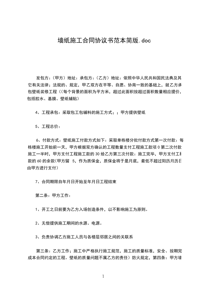 第三条:乙方工作;施工中严格执行施工规范,施工的质量标准,安全、按期完成本合同约定的工程。壁纸的质量问题不属乙方的责任)防火规定,第四条:甲方墙面处理;保证创造墙面可施工的条件,墙面要刮好泥子粉,打好沙纸,保证墙面平整,阴阳角垂直方正墙面出现问题与乙方无关。