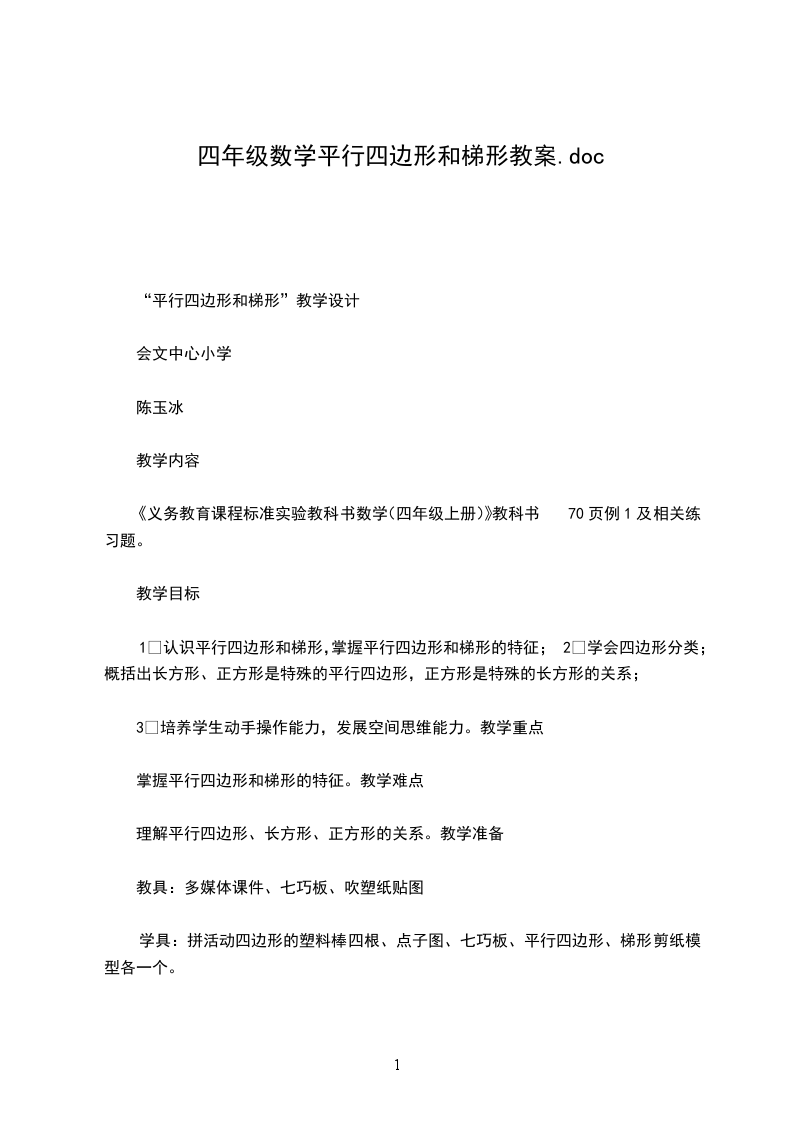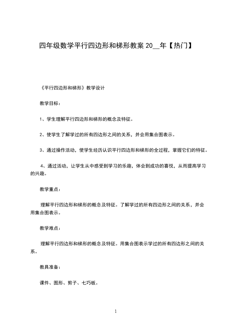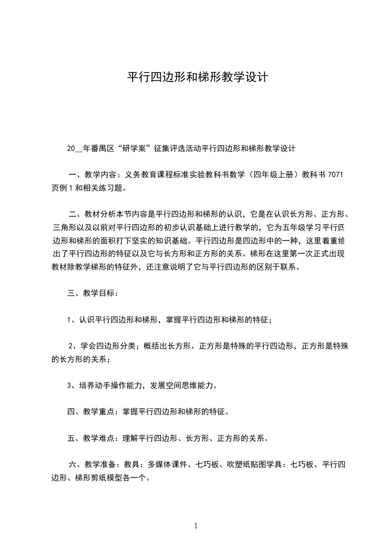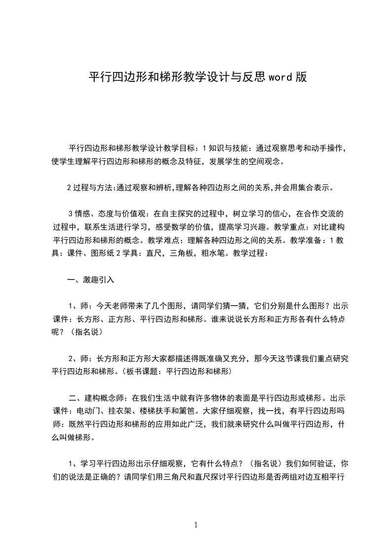 平行四边形和梯形教学设计教学目标:1知识与技能:通过观察思考和动手操作,使学生理解平行四边形和梯形的概念及特征,发展学生的空间观念。