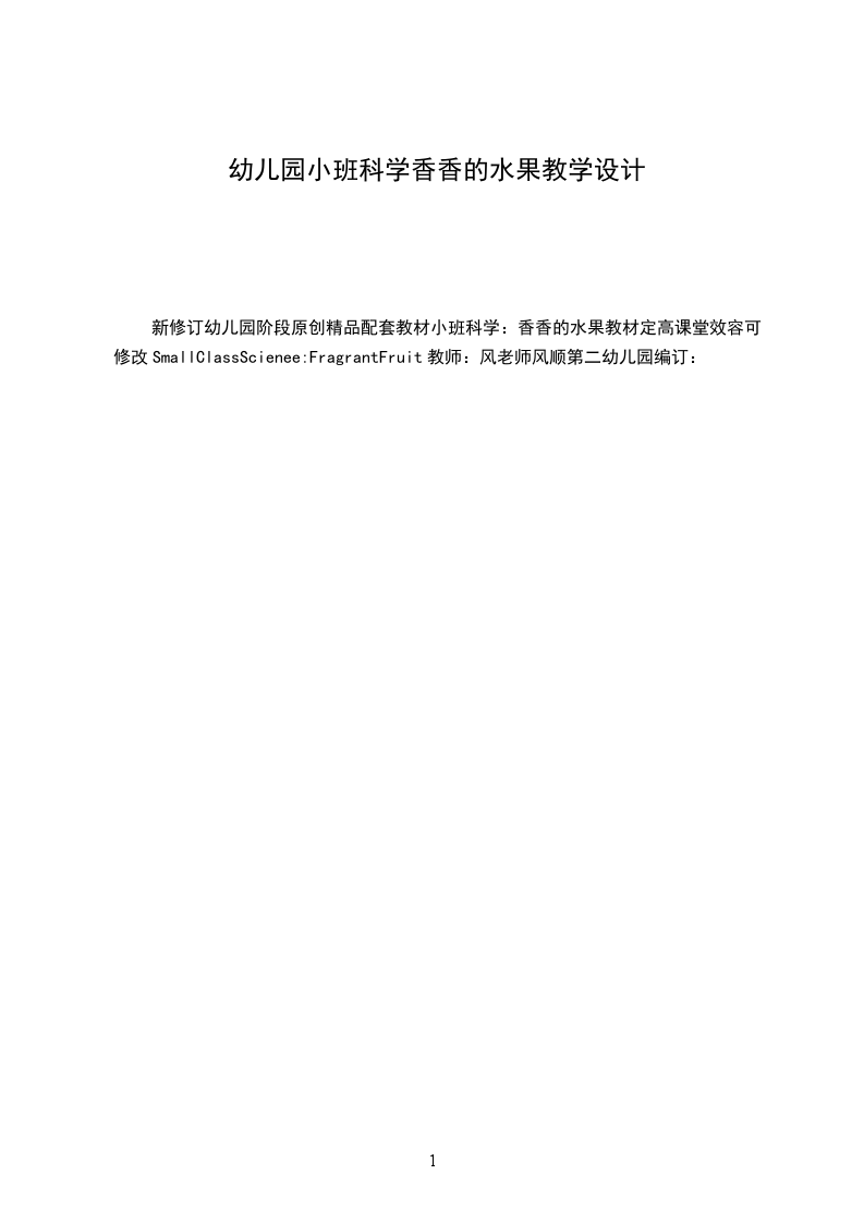 新修订幼儿园阶段原创精品配套教材小班科学:香香的水果教材定高课堂效容可修改SmallClassScienee:FragrantFruit教师:风老师风顺第二幼儿园编订: