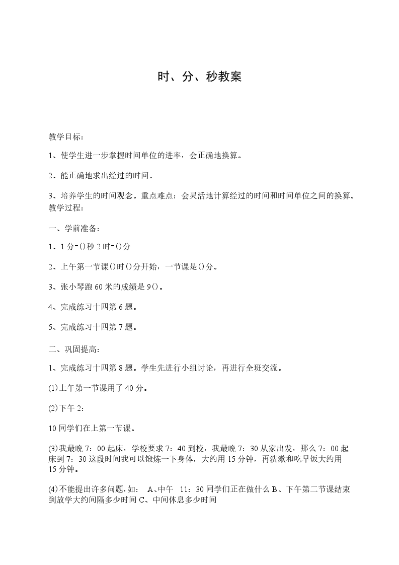 3通过教学,使学生体验数学与生活的密切联系,在运用所学知识解决问题的过程中,体验数学学习的乐趣。教学问题诊断分析:时间的简单计算是在学生认识了时、分、秒基础上进行教学。单位的换算,要注意紧密联系时间单位之间的进率(时=60分,分=60秒),由于学生没有学习两位数的乘除法计算,单位换算时注意给出数目较小的,用加减法计算就能进行的单位换算。时间的简单计算创设学生熟悉的生动的情境,激发学生的积极性,唤醒学生的生活经验,建立起经过时间的计算模型:终点时间起点时间=经过的时间。教学中渗透并强化解决问题的.三个步骤:阅读与理解、分析与解答、回顾与反思,帮助学生掌握解决问题基本方法。教学重点:掌握简单的时间单位的换算。