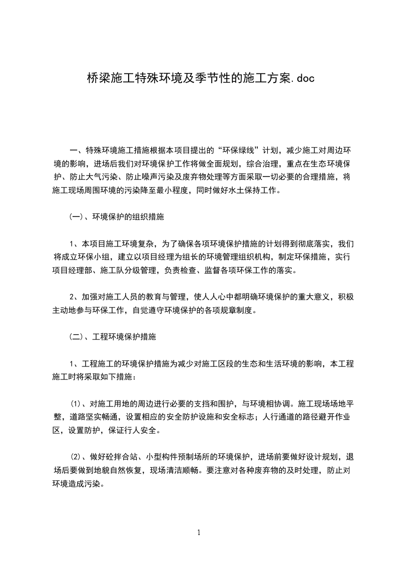 一、特殊环境施工措施根据本项目提出的“环保绿线”计划,减少施工对周边环境的影响,进场后我们对环境保护工作将做全面规划,综合治理,重点在生态环境保护、防止大气污染、防止噪声污染及废弃物处理等方面采取一切必要的合理措施,将施工现场周围环境的污染降至最小程度,同时做好水土保持工作。