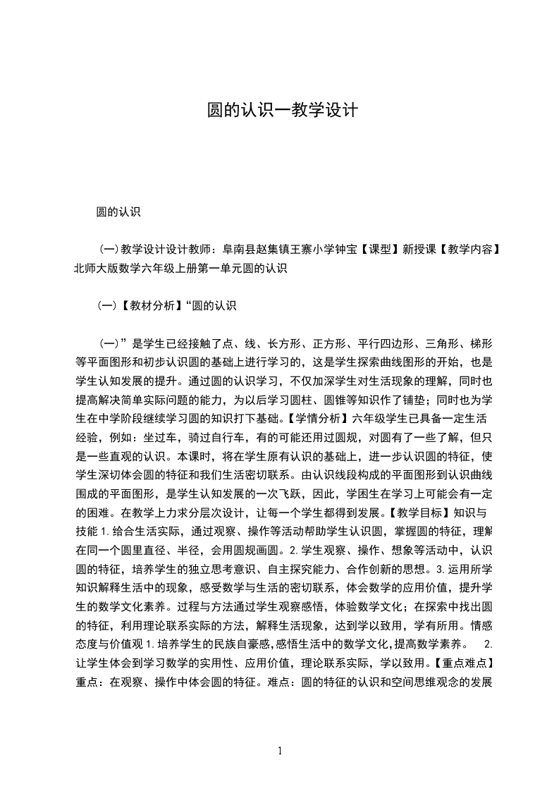 3.在活动中,感受圆与其它图形的区别,沟通它们的联系,获得对数学美的丰富体验,提升学生对数学文化的认同。教学重点:探索圆的各部分名称、特征和关系。教学难点:通过实际的动手操作体会圆的特征。教学过程:
