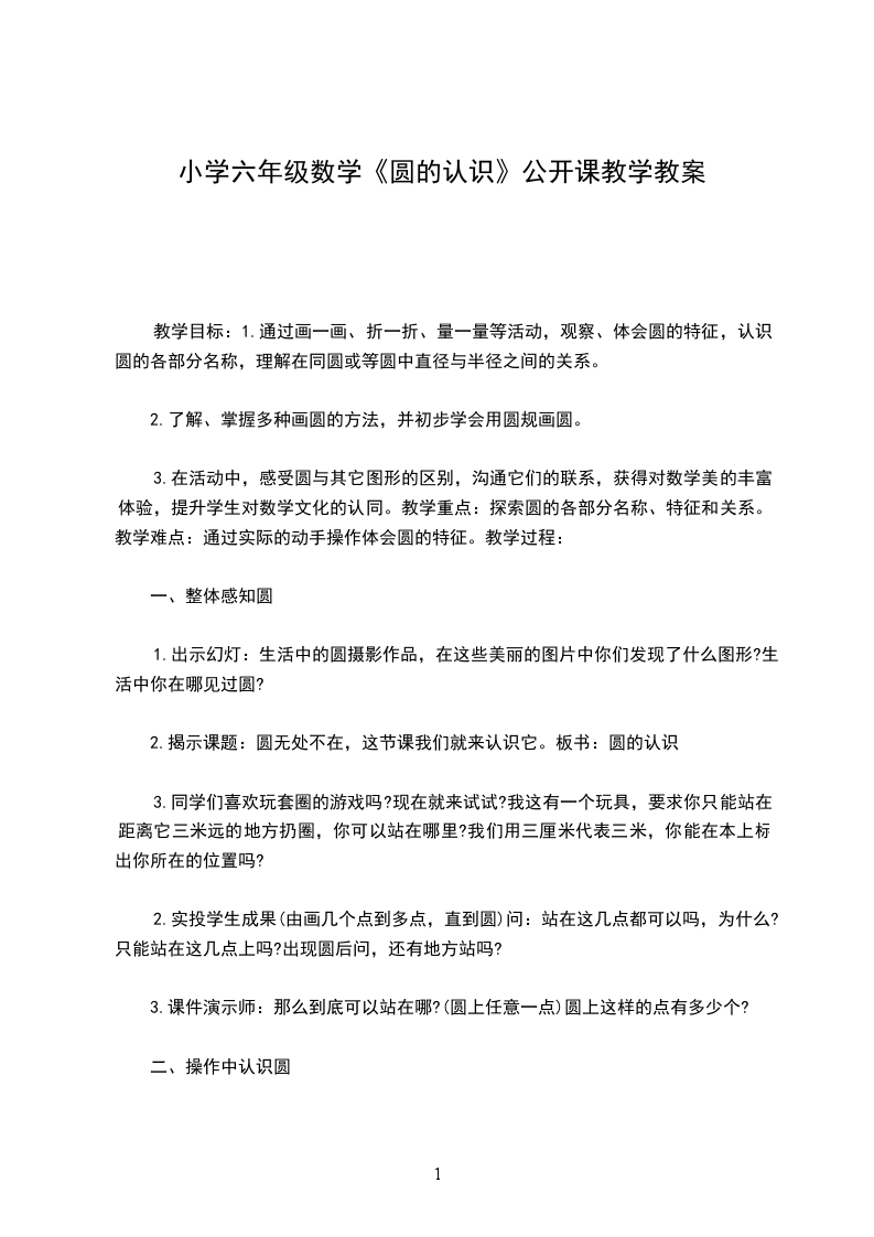 教学目标:1.通过画一画、折一折、量一量等活动,观察、体会圆的特征,认识圆的各部分名称,理解在同圆或等圆中直径与半径之间的关系。
