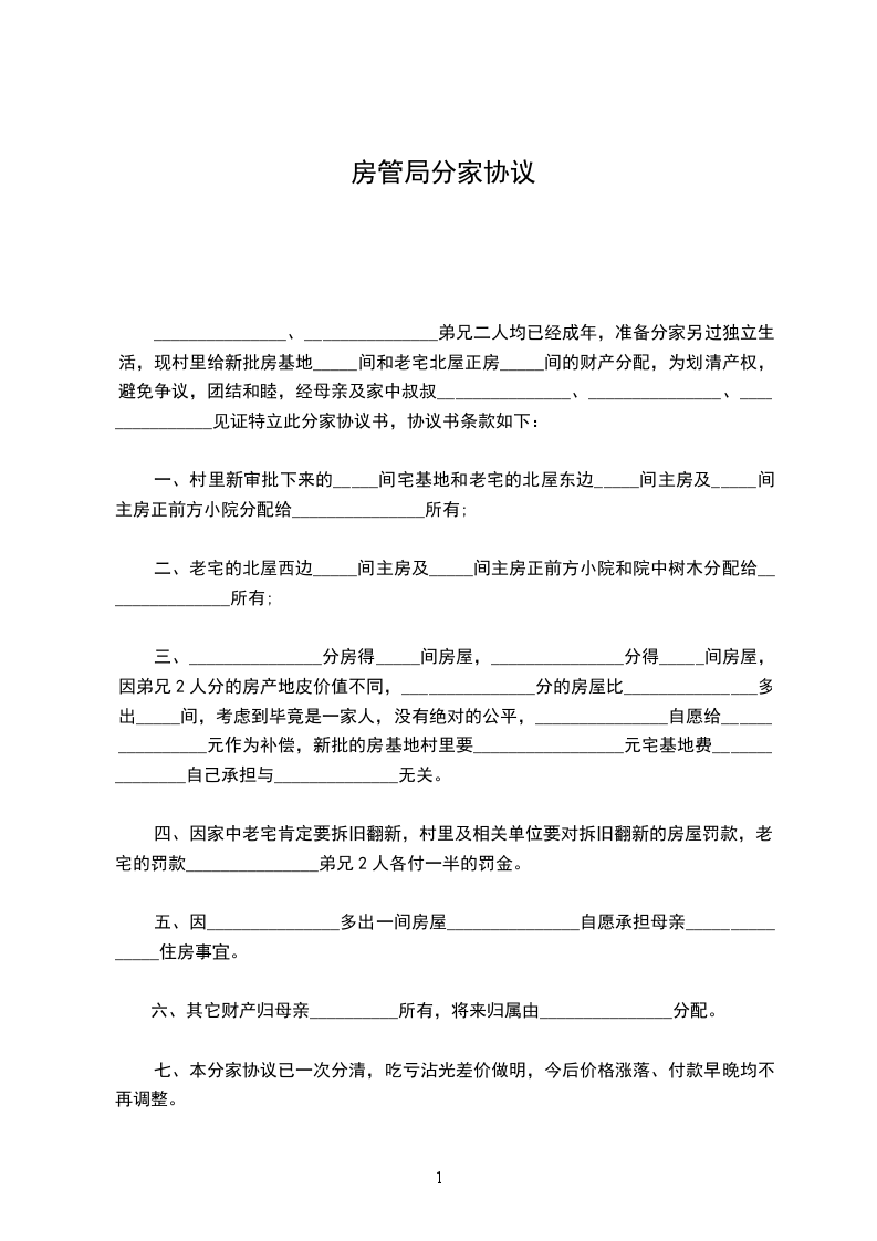 _______________、_______________弟兄二人均已经成年,准备分家另过独立生活,现村里给新批房基地_____间和老宅北屋正房_____间的财产分配,为划清产权,避免争议,团结和睦,经母亲及家中叔叔_______________、_______________、_______________见证特立此分家协议书,协议书条款如下: