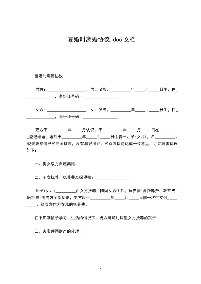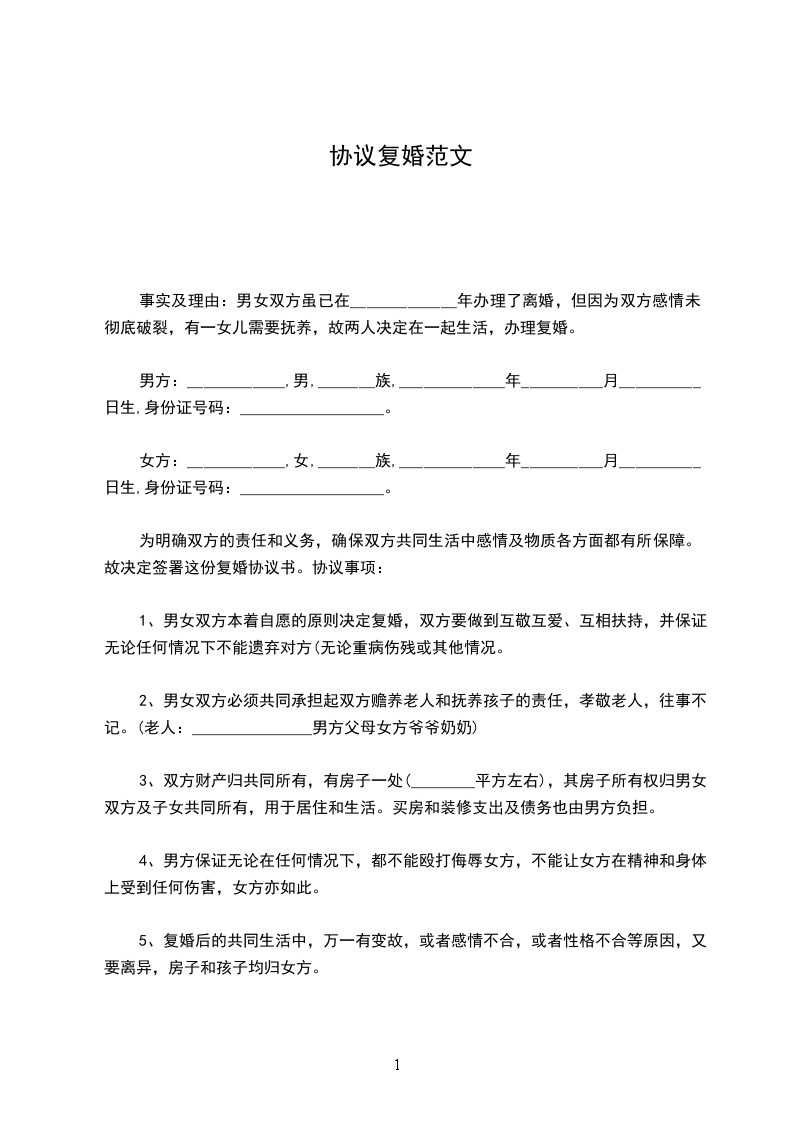 1、男女双方本着同等自愿的原则决定复婚,双方要做到互敬互爱、互相扶持,并保证无论任何情况下不能遗弃对方(无论重病伤残或其他情况。)