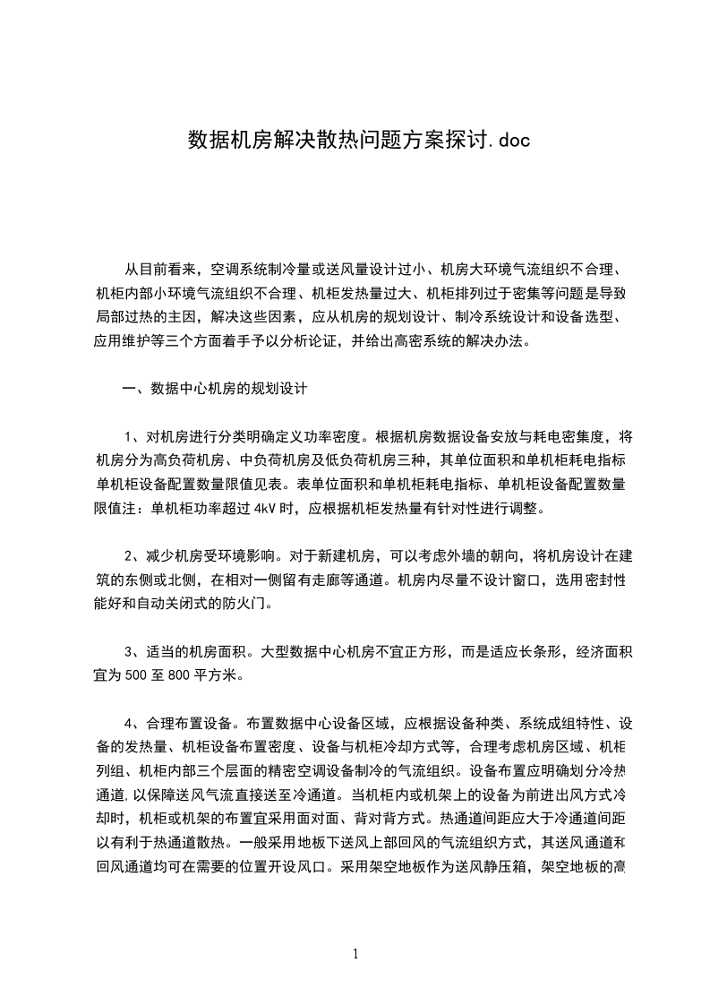 (2)机柜气流和机柜设计是引导空气最大限度改进冷却效果的关键因素。机柜对于防止设备排出的热气短路循环进入设备进气口至关重要。热空气将被轻微增压,再加上设备进气过程中的吸力,将可能导致热空气被重新吸入设备进气口。气流短路问题可能导致IT设备的温度上升8C,其结果的将要远远大于热气造成的影响。由于模块化数据网络设备基本上是水平方向进出风(最常见的方式是前进后出),因此空调制冷气流也应符合这种气流组织:尽量将冷气送到所有数据设备的前方位置。采用标准机柜和盲板可以大幅减少气流短路比例,能消除机架正面的垂直温度梯度,防止高温排出空气回流到机架前部区域,并确保供应的冷空气在机架上下配送均匀。下送风机房机柜前后门的设计应符合最佳制冷效率的要求,有2种方式可选择:a)前门完全密闭,不做通风孔;后门通风网孔大小为5,后门通风率30-40%,这种方式,由机柜底部调节的开口,在机柜内设备正面送冷风,由后门和机柜顶部散热;每个机柜需要侧门,侧门不带通风孔,冷风通道完全在机柜下方。b)前后门底部起密闭,不做通风孔,机柜上部为通风散热部分,通风网孔大小为5,通风率30-40%,这种方式主要出风口在机柜的底部,同时可以在机柜列间通道开辅助送风口,在机柜内设备正面送冷风,由后门和机柜顶部散热。每个机柜需要侧门,侧门不带通风孔。冷风通道在机柜下方和机柜列间通道。机柜内数据设备与机柜前、后面板的间距宽度应不小于50mm。机柜层板应有利于通风,为避免阻挡空气流通,层板深度应不大于600mm多台发热量大的数据设备不宜叠放在同一层板上,最下层层板距离机柜底部应不小于200mm把热负荷最大的设备安装在机柜中部位置,以便获得最大的配风风量。机柜底部采用活动抽屉板,随设备多少,改动冷气入口大小。机柜底部后半部堵住,阻止冷空气从底部向后面流去。、加强数据中心维护管理一旦冷却系统设计安装完成,为保证系统的高性能,进行后续检查工作是很重要的。更重要的是,要维护从服务器排出的热空气到空调装置的回流空气管道之间的洁净通道。很多因素都会降低现有冷却系统的运作效率和功率密度能力。故在日常维护管理注意检查总的冷却能力,确保数据中心的IT设备对冷却的需要没有超过总的冷却能力。检查所有风扇和报警装置是否运行正常,确保过滤器的清洁状态。检查冷却器和外部冷凝器及初级冷却回路的状况。检查数据中心通道中重要位置的温度。记录每套机架底部、中部和顶部的空气入口处的温度,并与IT设备生产商的推荐值进行比较。检查可能影响冷却性能的机架间隙(没装挡板的闲置机架空间、没装挡板的空刀片插槽、未封闭的电缆开口)或多余的缆线。在机架中安装挡板,实行电缆管理制度。让设备底部流出的热空气可以通过机架内未被利用的纵向空间回到空气入口处,使设备没有必要升温。